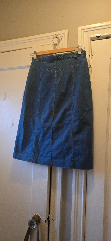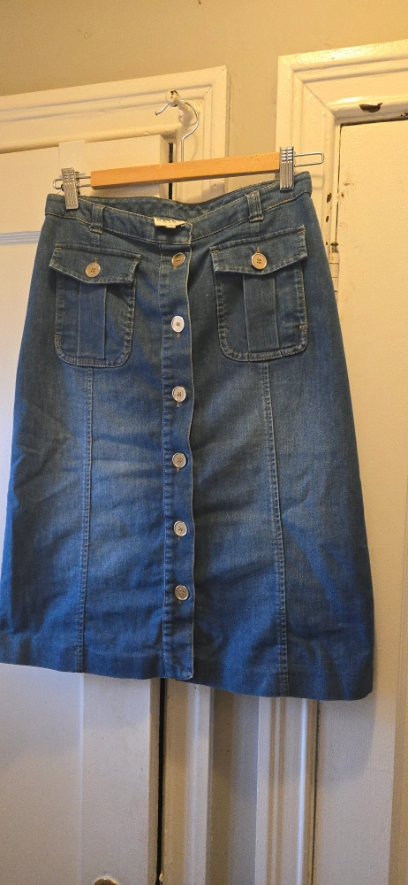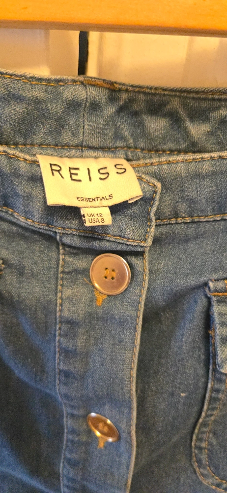 Reiss denim skirt in size 8! knee leangth or just below it. It's in great condition and features a button-down front and two front pockets.