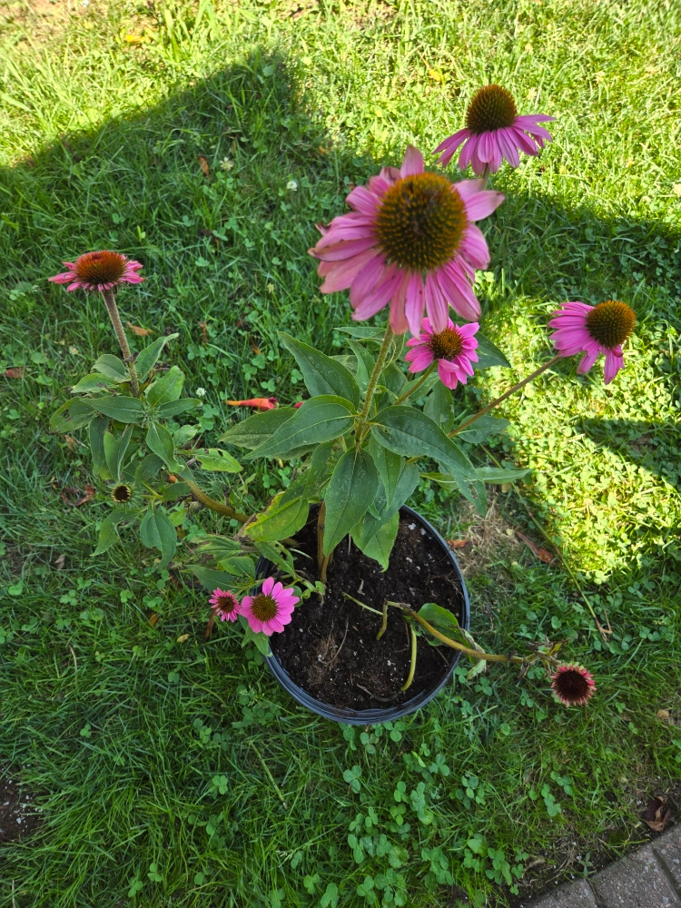 39Ready to plant perennial.....free potted purple coneflower plant! It's currently planted in a black pot and ready to brighten up your garden or indoor space with its vibrant colour.