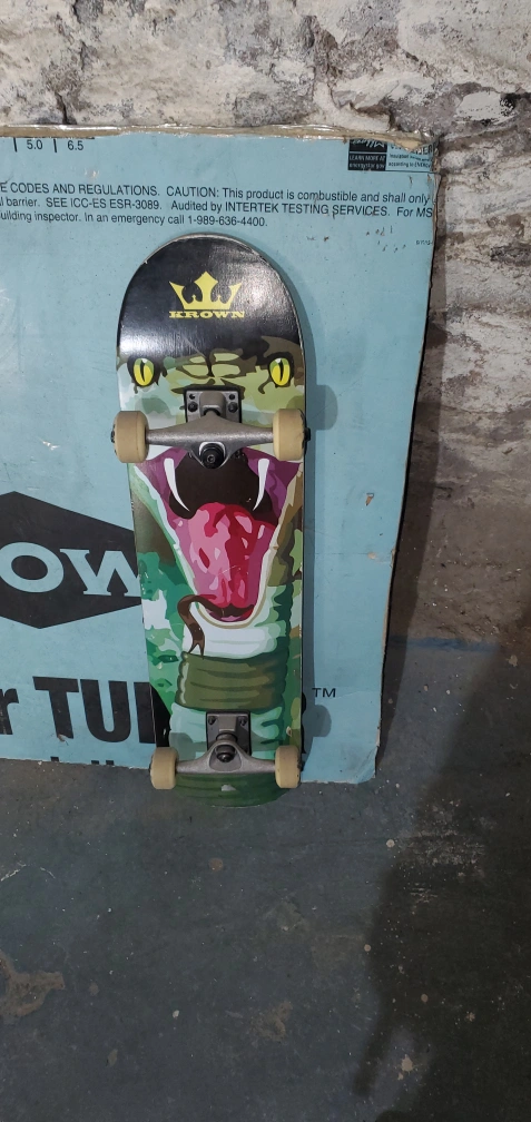 Selling a cool Crown skateboard featuring a striking snake design! It's perfect for beginners or anyone looking for a fun ride. The board shows some signs of use, but it's still in good condition and ready to roll. Grab it and hit the streets!