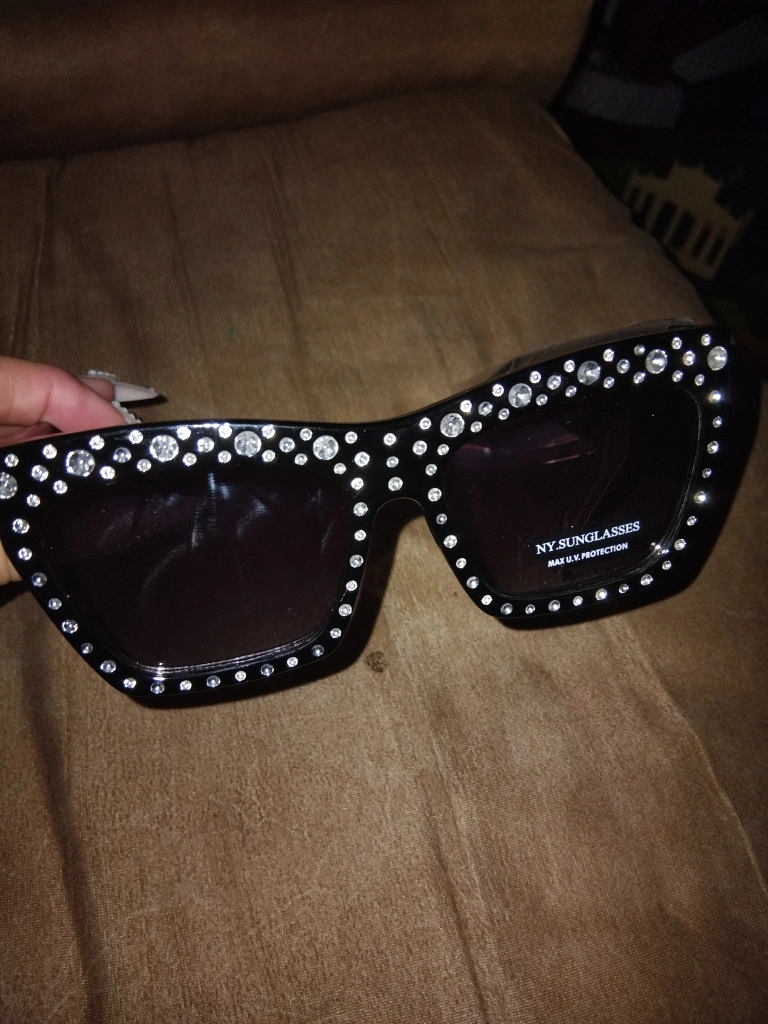 Selling a pair of NY Sunglasses. They are black and have rhinestones around the frames. They offer MAX U.V. PROTECTION