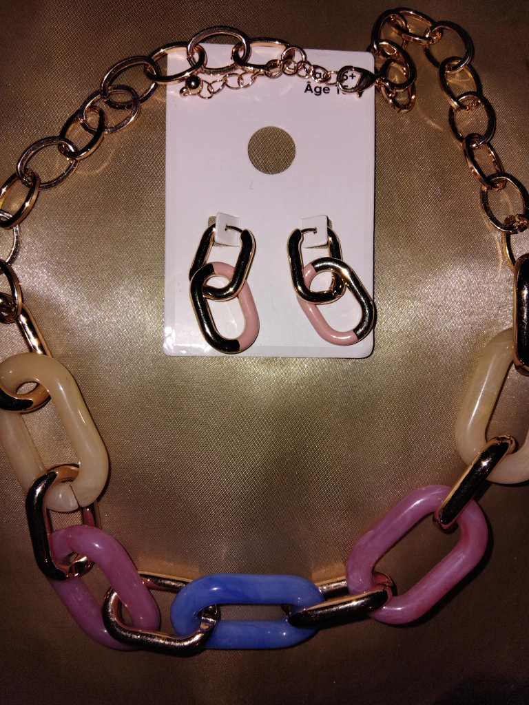 A cute necklace and earrings set! The necklace has large colourful links in pink, blue, and cream with gold-tone hardware. The earrings are a matching design with a gold and pink link design. Perfect for adding a pop of colour to any outfit!