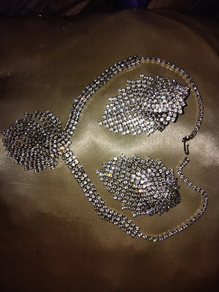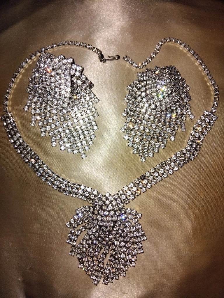 Sparkly rhinestone necklace and earrings set! Perfect for adding some bling to your outfit. The set includes a necklace and matching earrings, all adorned with shimmering rhinestones. Great for parties or special occasions!