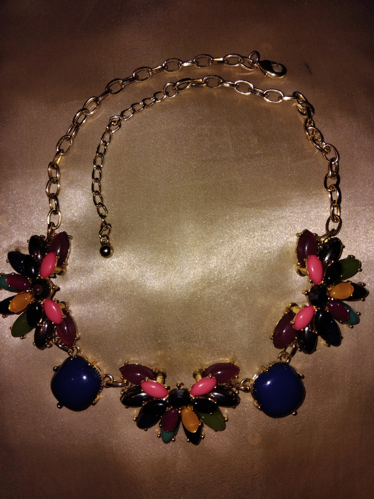 Add a pop of colour to any outfit with this eye-catching statement necklace! The gold chain complements the vibrant jewel tones, making it a fun and versatile piece