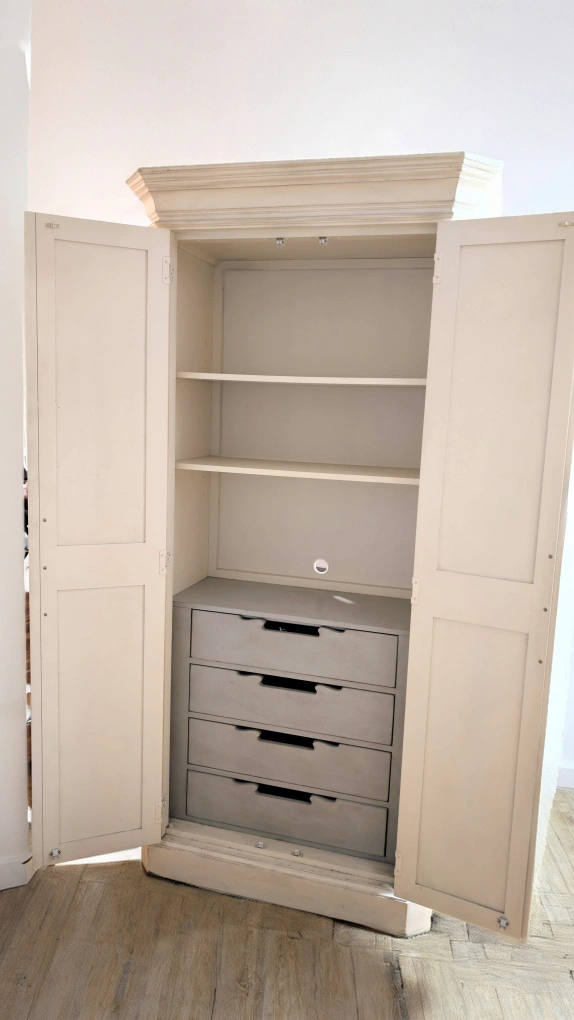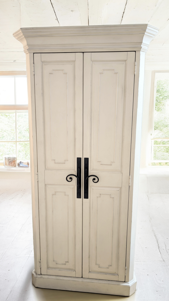 This armoire is perfect for adding storage to any room! It features a classic design with a French white as shown in the images and from Paula Deen's River House collection (discontinued). The armoire includes shelves and drawers, offering versatile storage options. Made of solid woods and super heavy-weighs about 340 lbs. Strong, sturdy and durable. Interior drawers and shelves are removable to lighten the carrying load.
