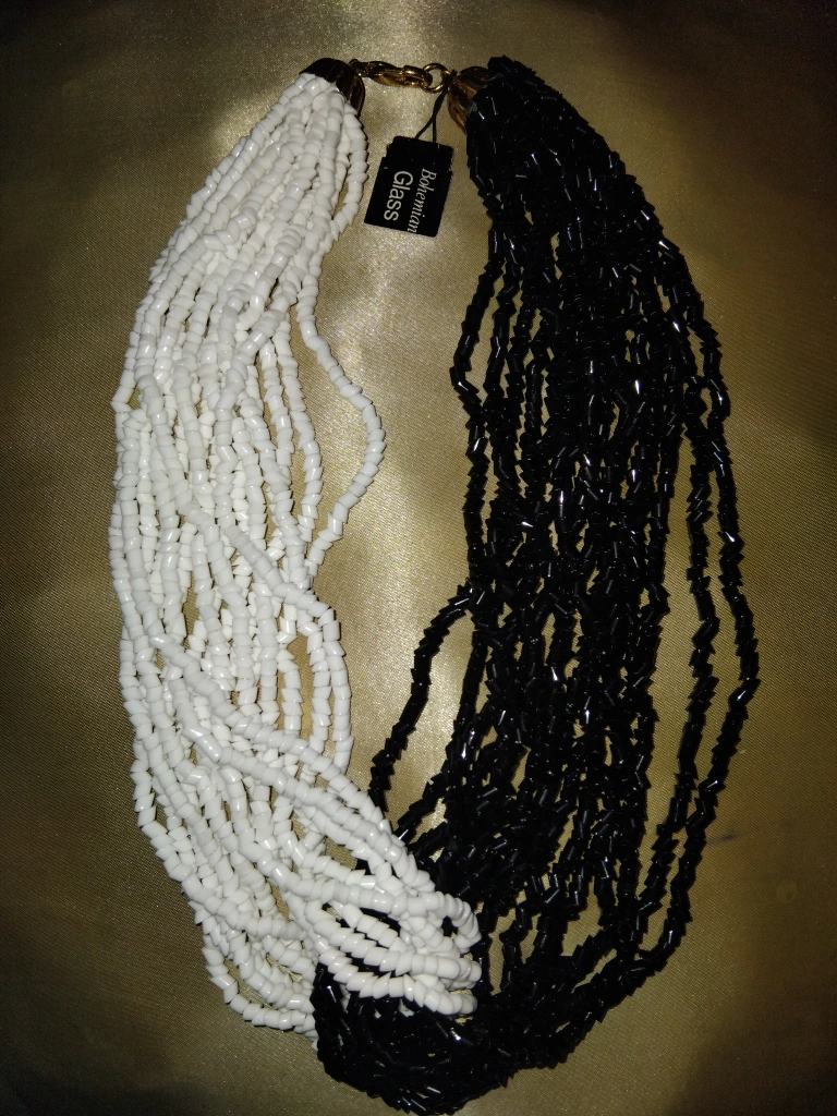 Check out this striking Bohemian Glass beaded necklace! It features a unique half-black, half-white design that's sure to catch the eye. Perfect for adding a touch of elegance to any outfit!