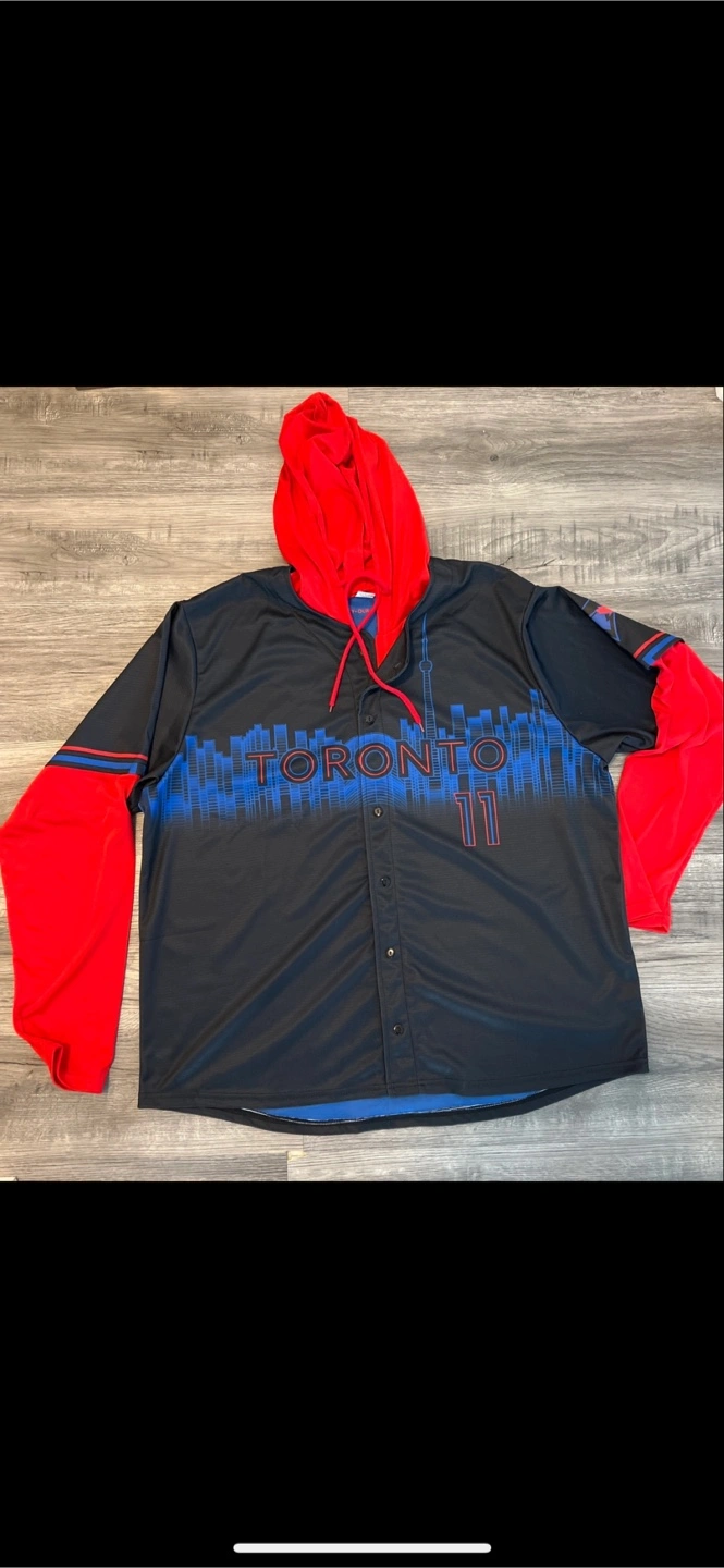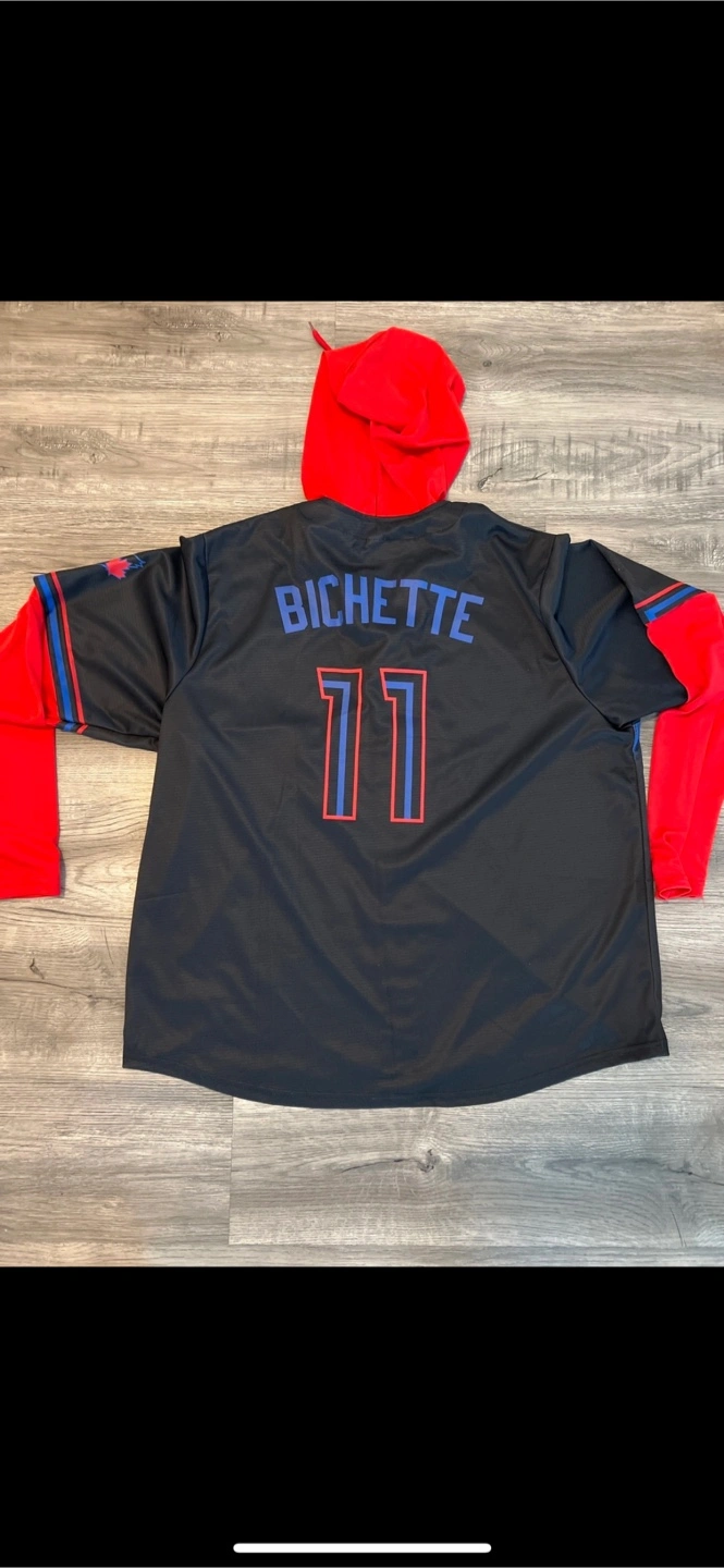 Selling a Toronto Blue Jays jersey featuring Bichette's name and number 11! It's a unique design with a red hoodie and sleeves attached to a black jersey featuring the Toronto skyline. Perfect for showing your team spirit! Brand new never worn. Size is extra large.