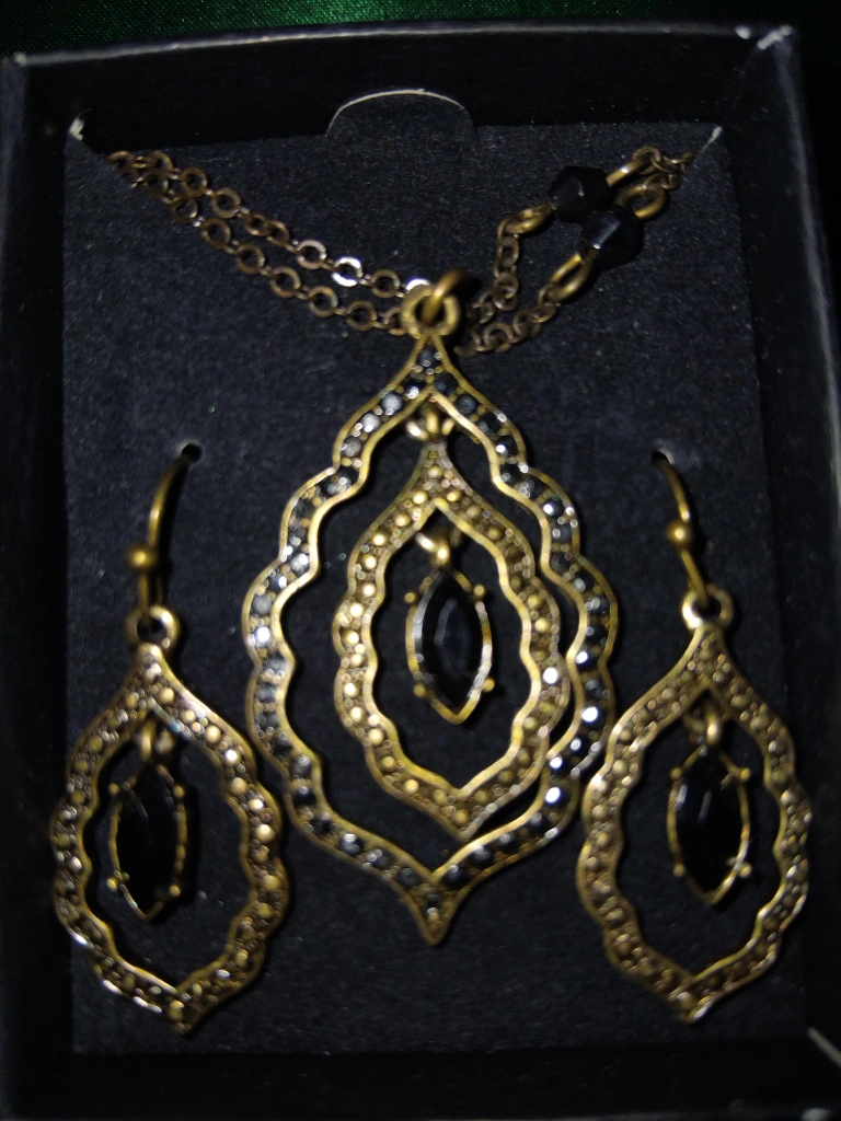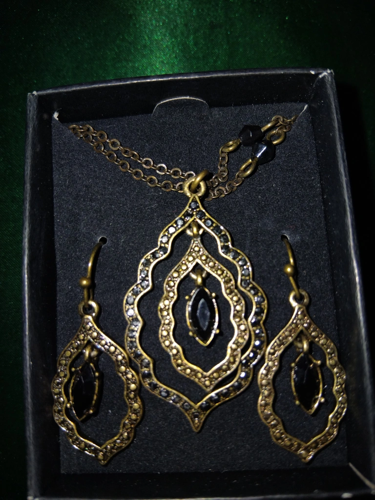 Selling a beautiful necklace and earring set! It comes in its original box. The set has a bronze-coloured metal with black accents. Perfect for adding a touch of elegance to any outfit