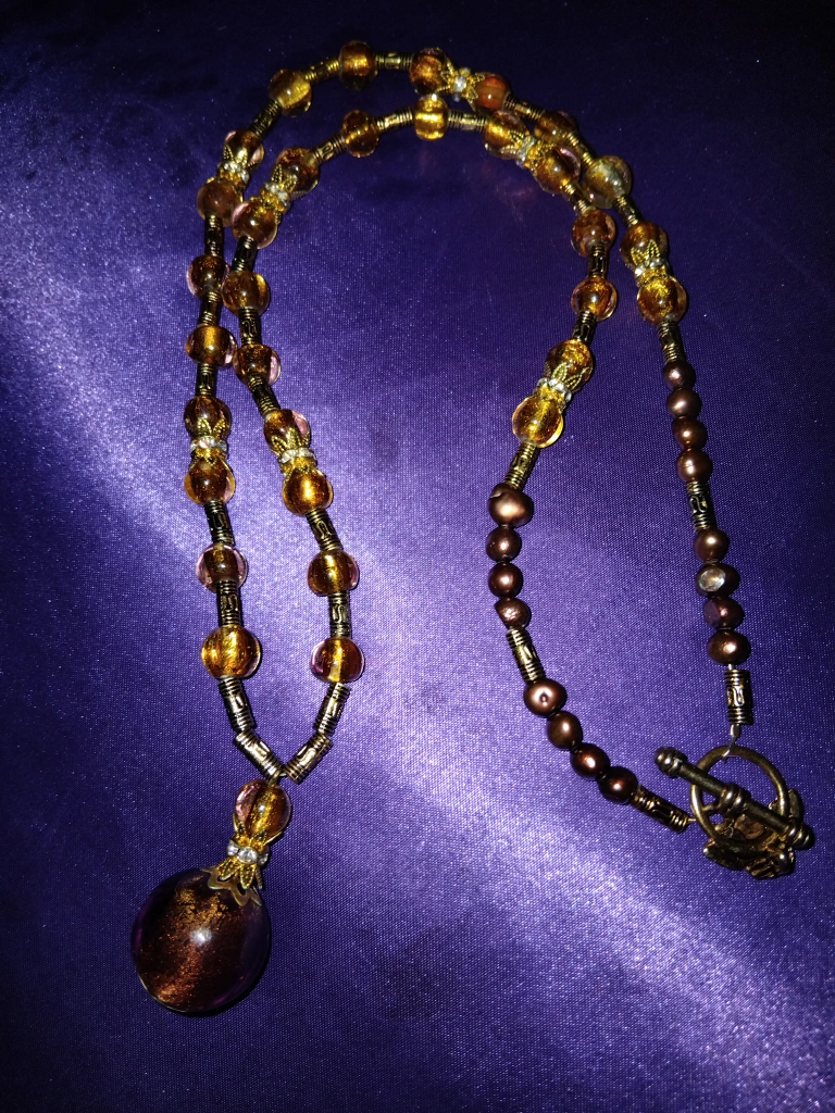 Beautiful beaded necklace with a mix of brown and gold tones! This necklace features a unique toggle clasp and a large pendant bead. Perfect for adding a touch of elegance to any outfit
