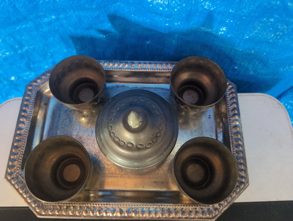 Selling a vintage silver plated tea set. It includes a tray, a lidded sugar bowl, and four small cups. It has some signs of wear and tarnish due to its age, but it still has a lot of charm