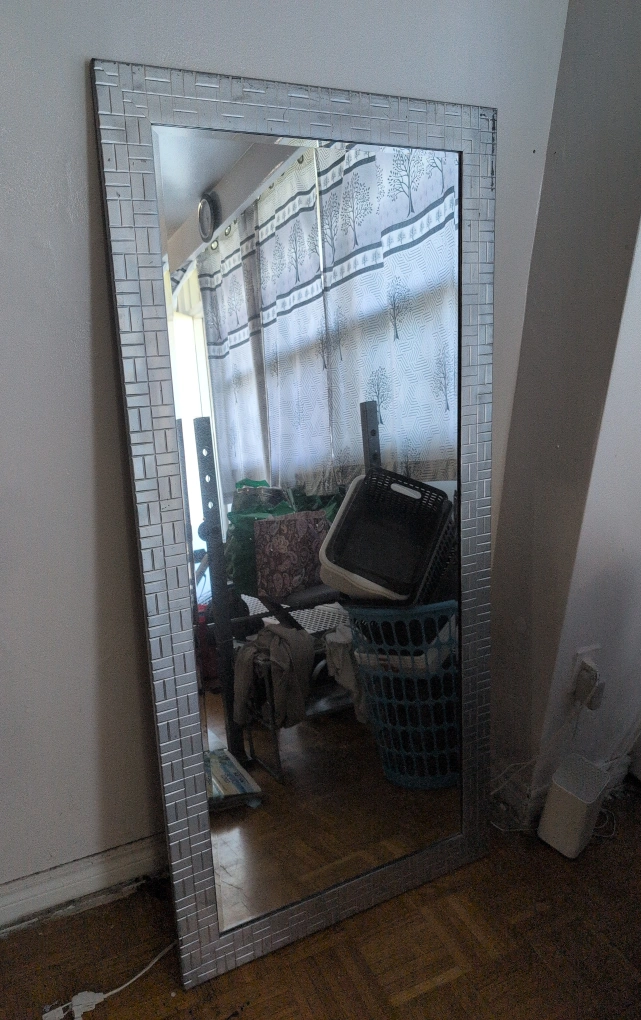 Selling a large wall mirror with a silver mosaic-style frame. It's in good condition and ready to brighten up any room!