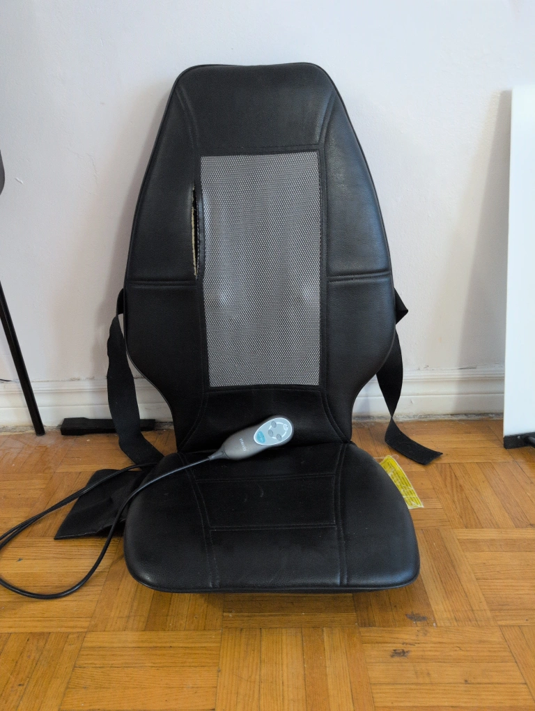 Offering a HoMedics massage seat cushion! It's in great shape and ready to help you relax. Perfect for home or office use. It has shiatsu type rollers.