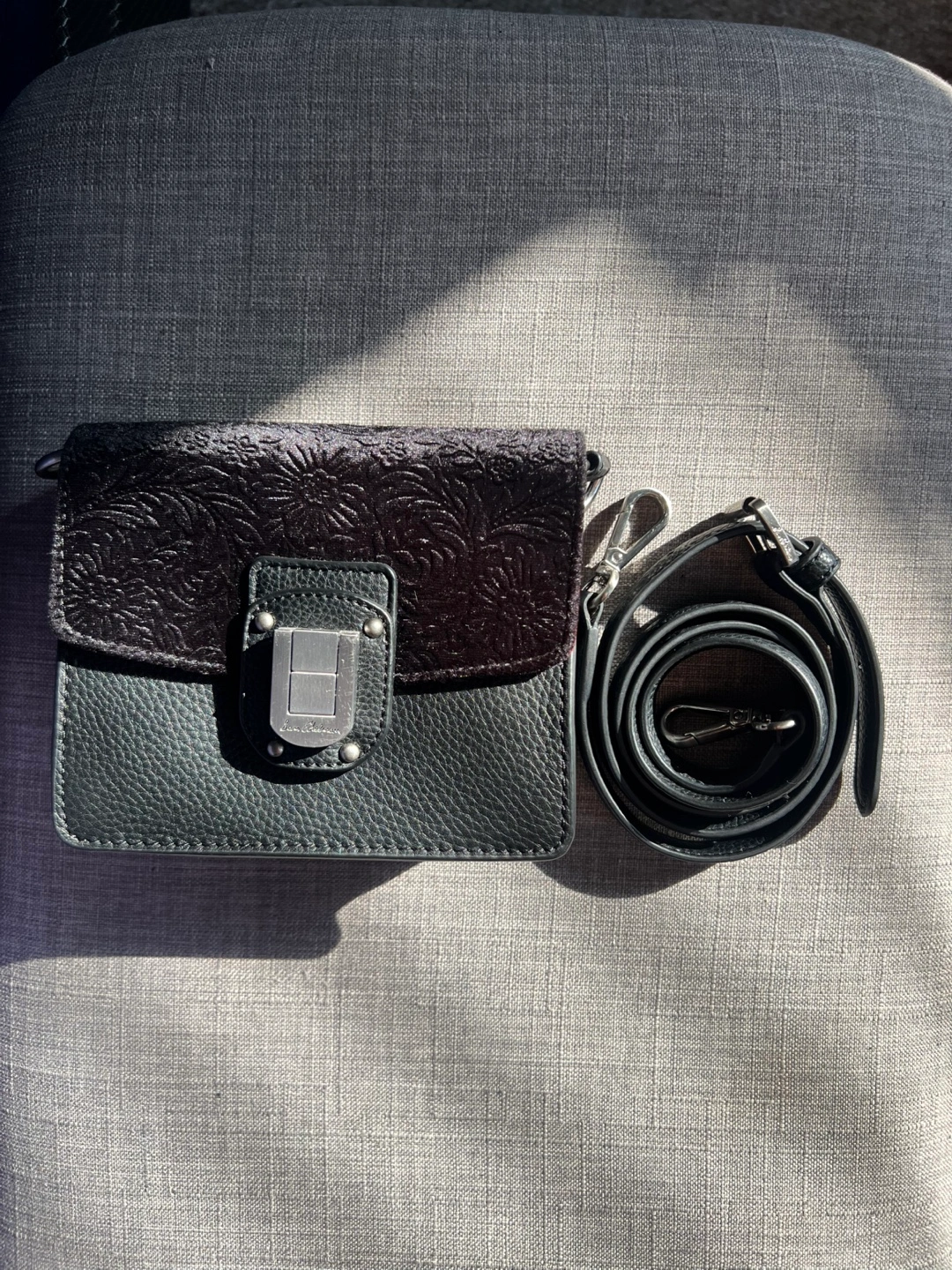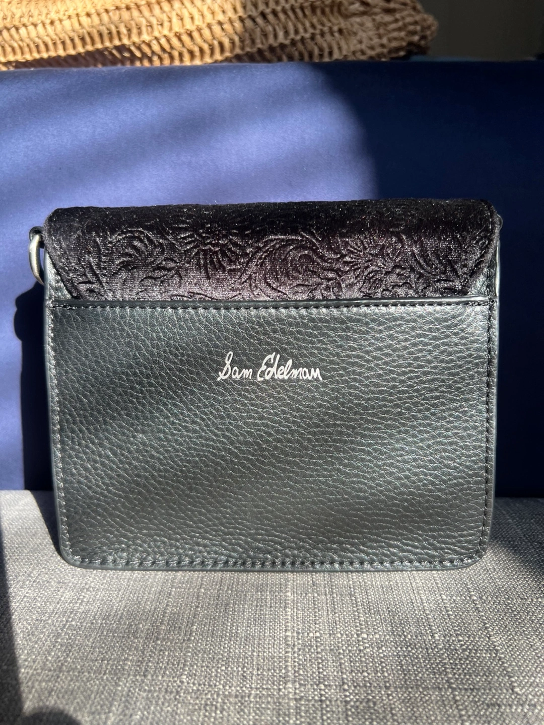 Cute black crossbody bag by Sam Edelman! It has a unique velvet floral design on the flap and a red velvet interior. The bag comes with a detachable strap. Great for wedding attire! Inner zippered pockets and magnetic closure.