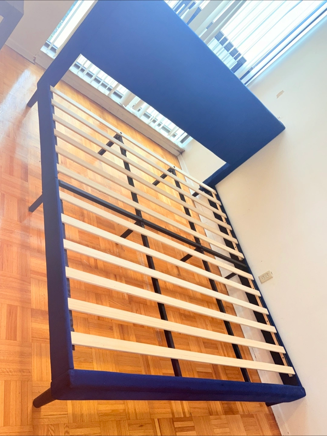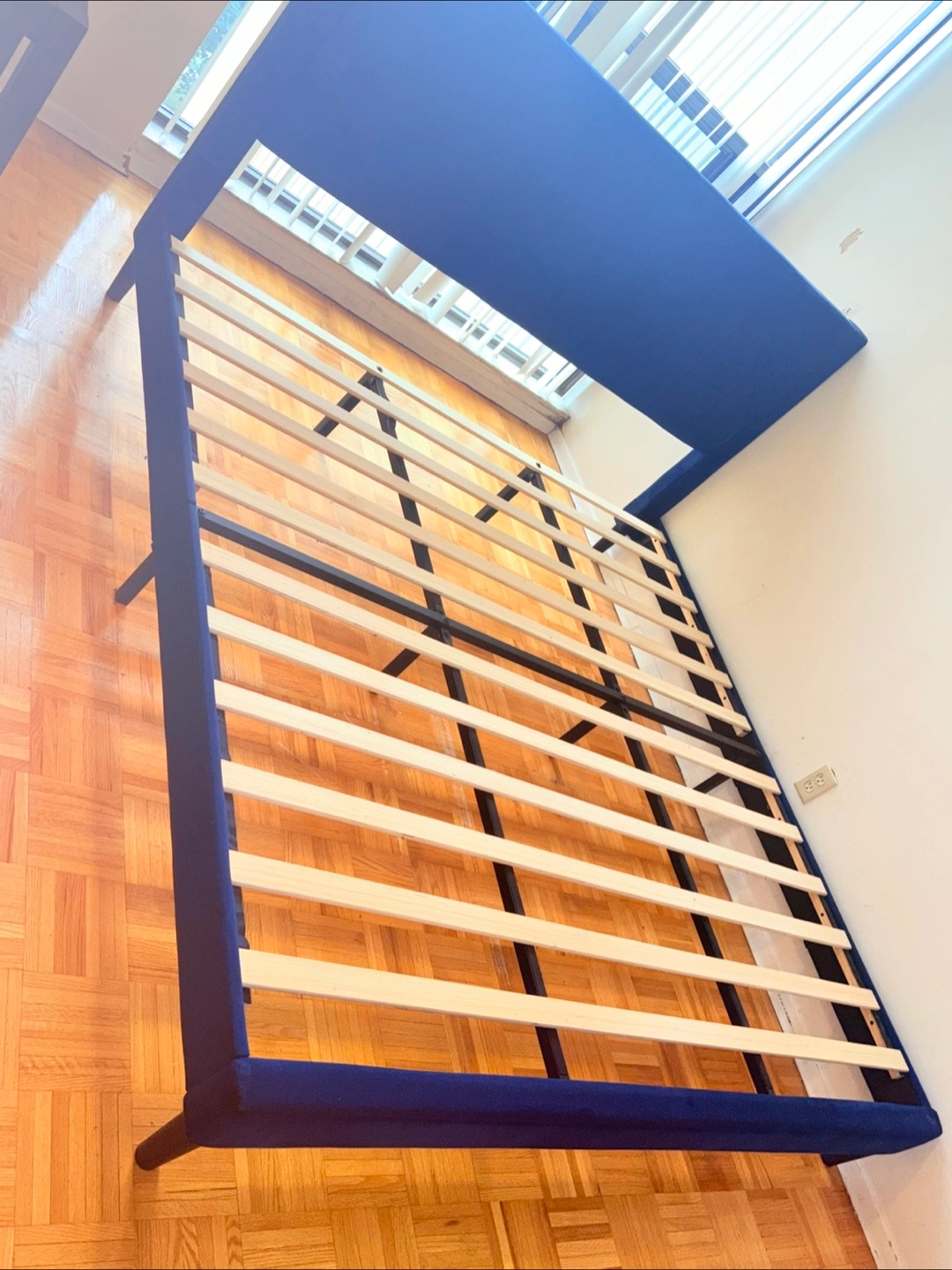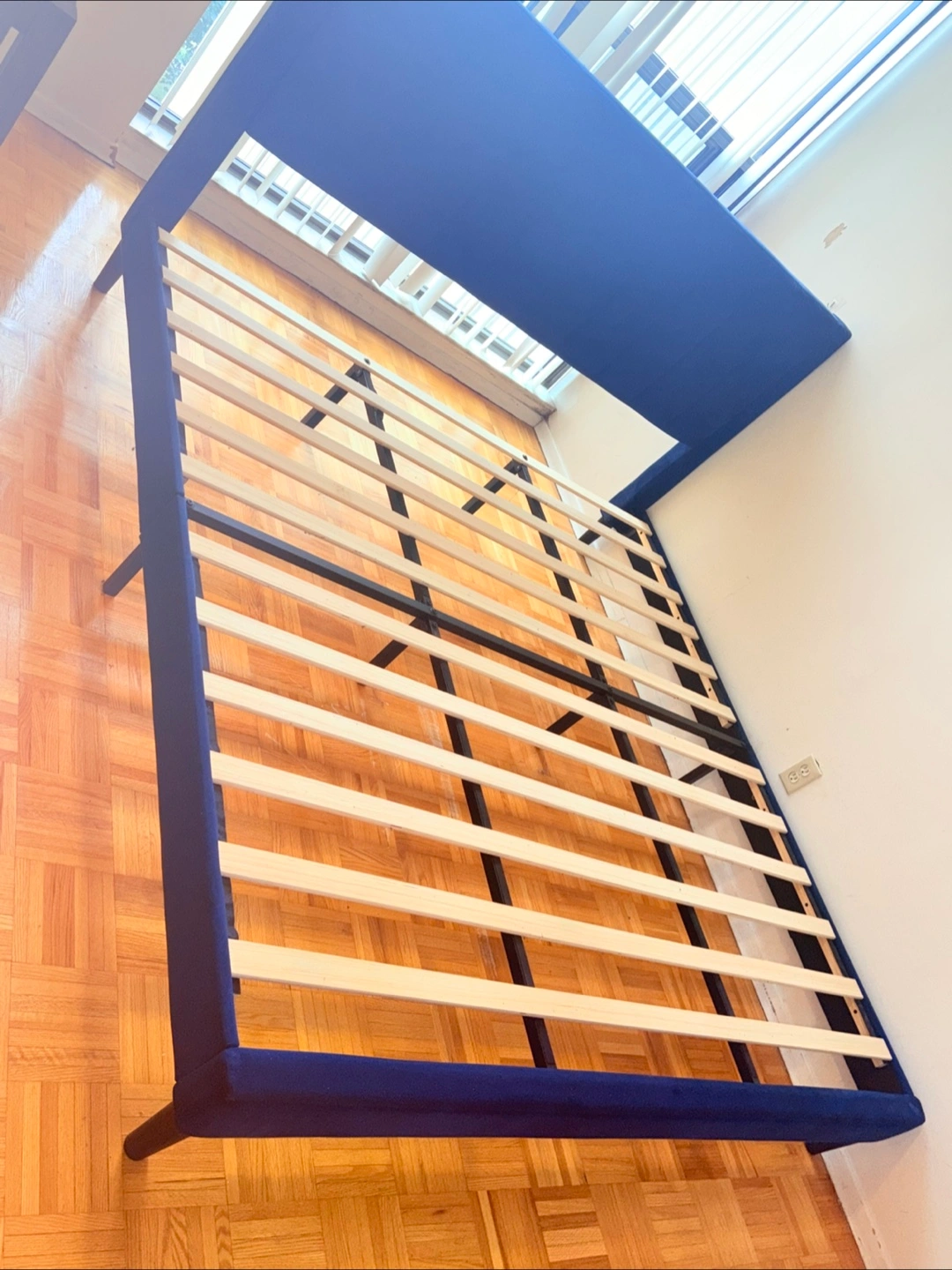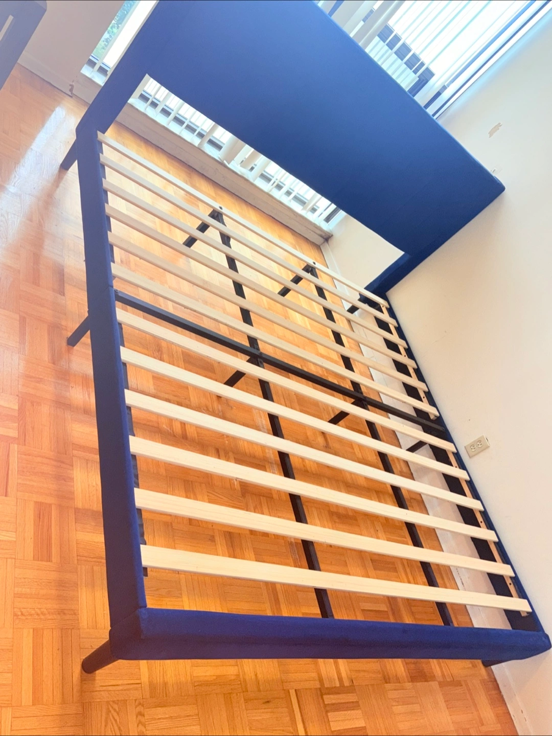 Selling a blue velvet upholstered king size bed frame. It's in good condition and would be a great addition to any bedroom!!