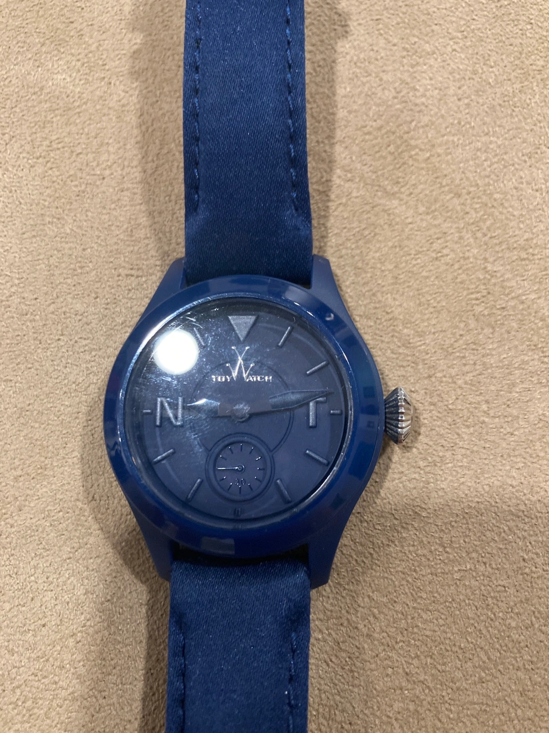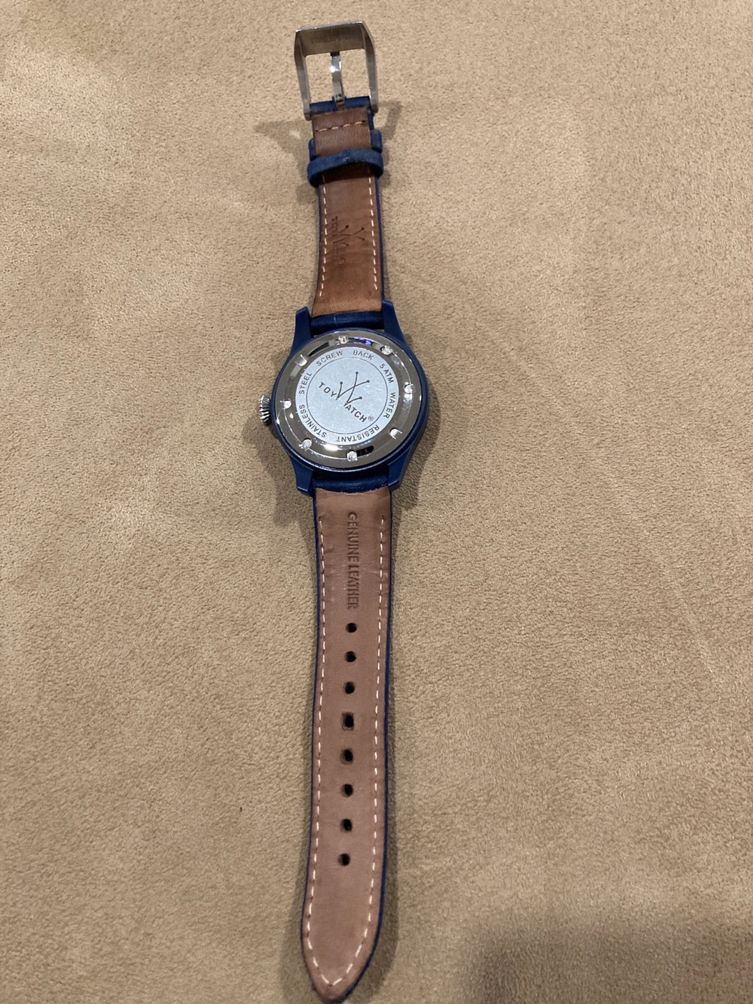 Navy blue ToyWatch with a genuine leather strap! It's a stylish timepiece that's sure to catch the eye. The watch features a blue design and is water resistant. The strap is made of genuine leather, adding a touch of luxury and comfort.