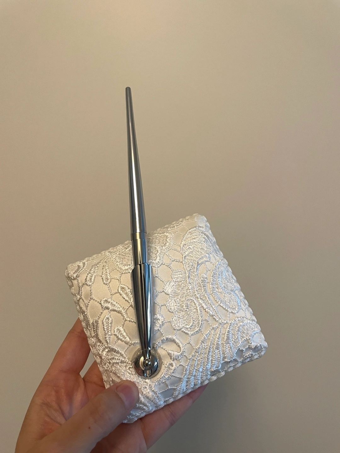 Selling a wedding pen with a beautiful lace pillow base. It's perfect for signing your guest book or other important documents on your special day. The lace pillow adds a touch of elegance
