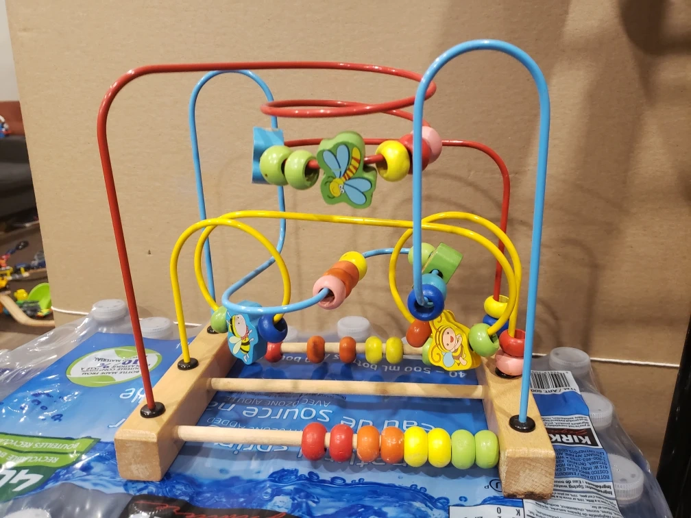 This is a cute wooden bead maze toy for kids! It has colourful beads and shapes on a wooden base with wire tracks. Great for developing motor skills and hand-eye coordination..