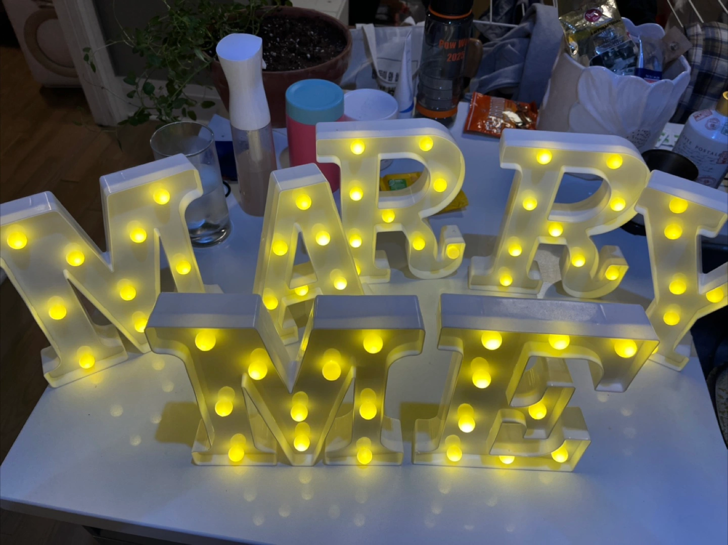 Selling a set of light-up letters that spell out "Marry Me"! They're in great condition and would be perfect for a proposal