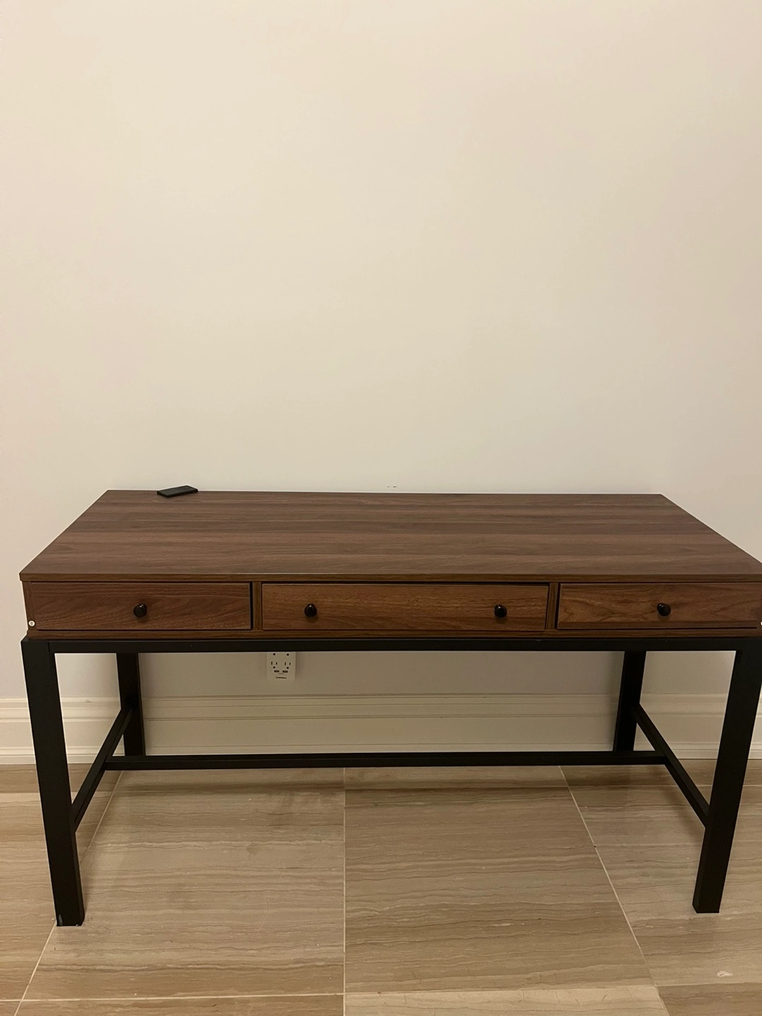 Here's a simple desk with a dark wood-look top and black metal legs. It has three drawers for storage, perfect for a home office or study space. The desk is in great condition and ready for a new home!