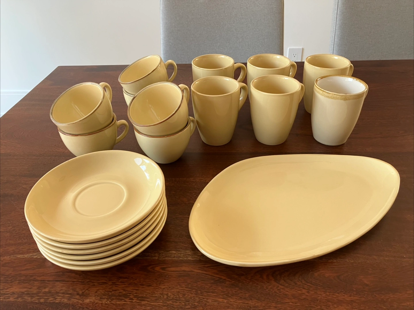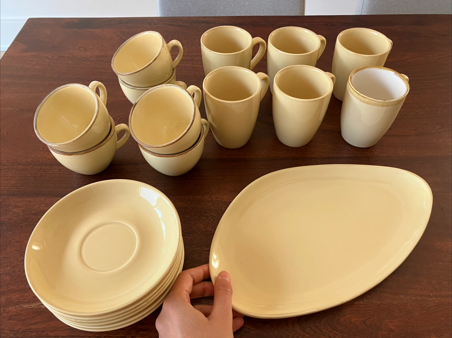 Selling a lovely brand new yellow tea/coffee set made of durable ceramic. The set includes everything in the picture (20 pieces) + 2 more mugs with saucers (8 in total, not 6 as in the picture) but you can also just get parts of it. Just ask for pricing of the pieces you’re interested in!