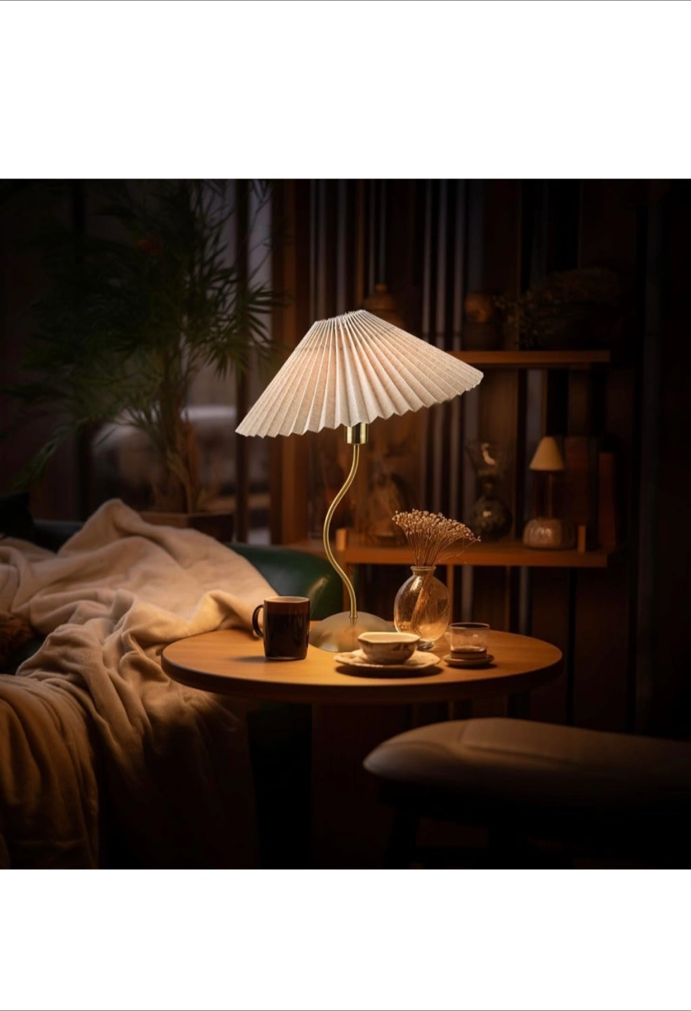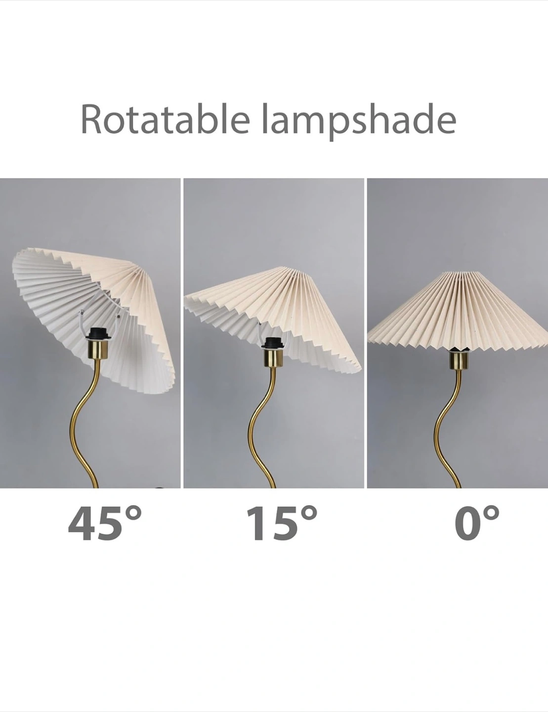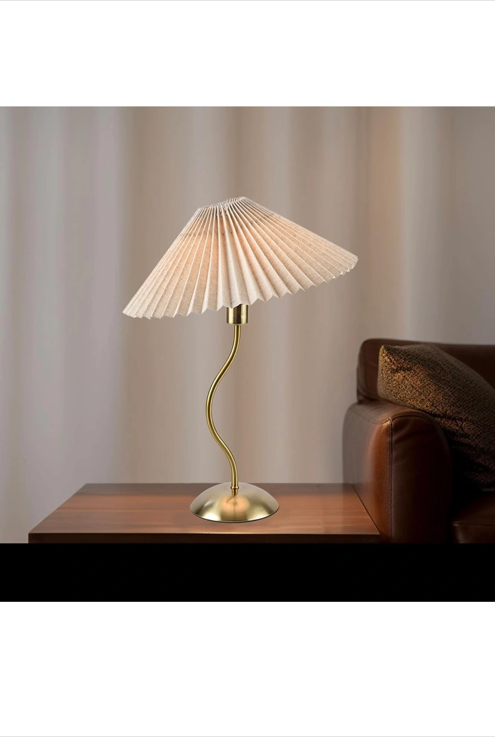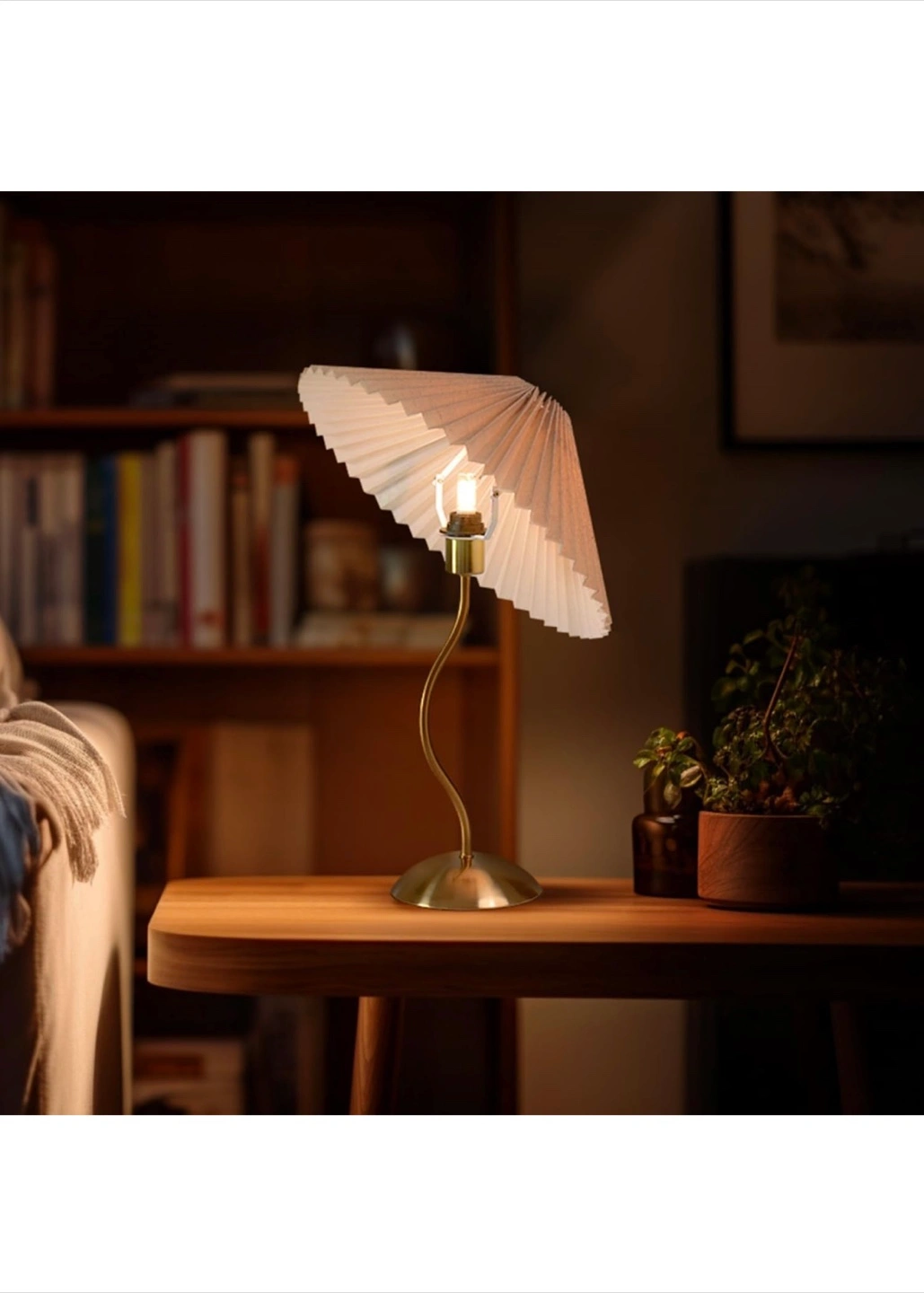 The lamp has a brass and coloured base and a curved stem, making it a beautiful decorative piece as well as a functional light source.