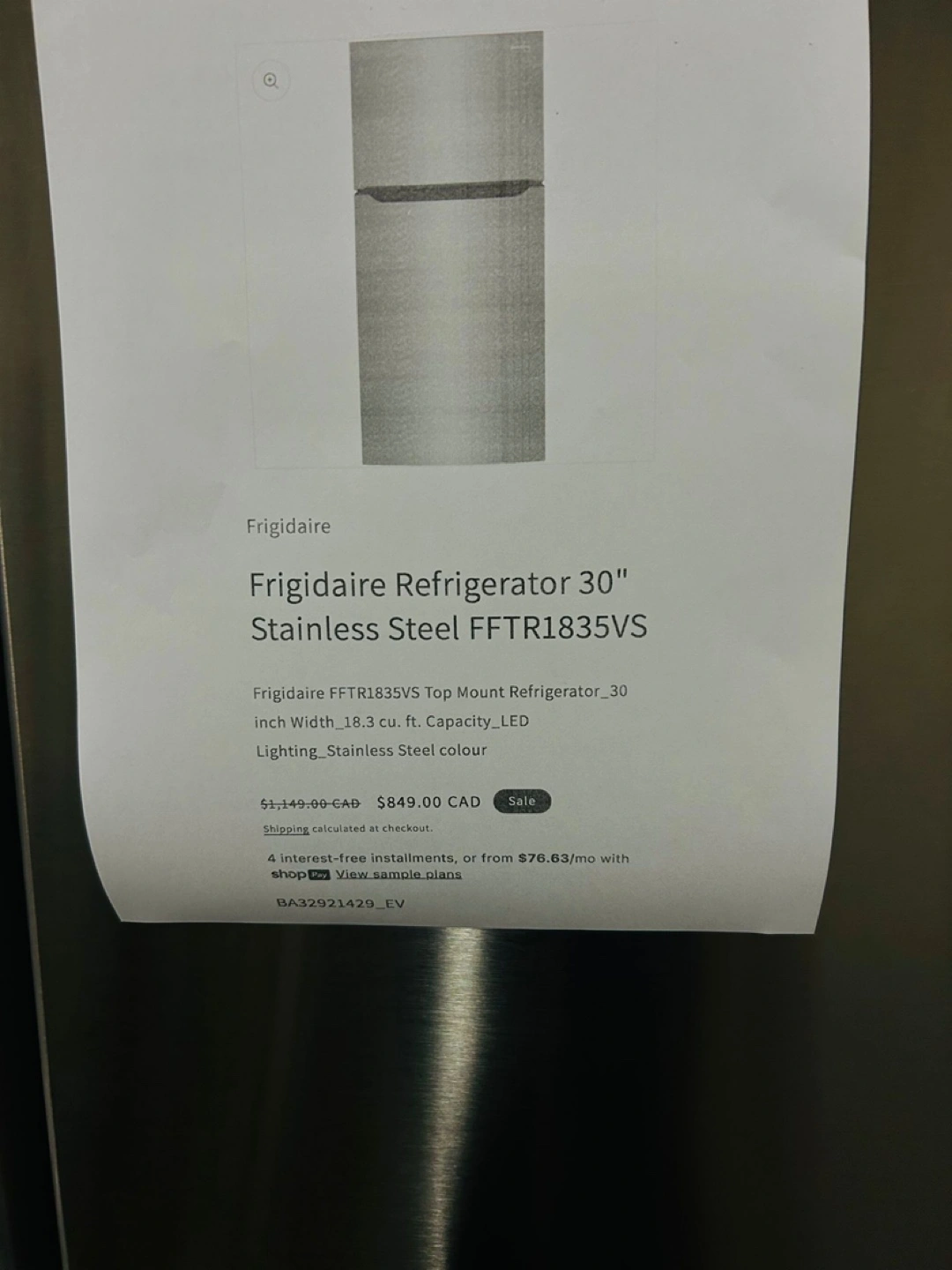 Stainless steel Frigidaire brand new fridge with warranty, we are located in Scarborough and we do delivery. Call me for more information 4039297194