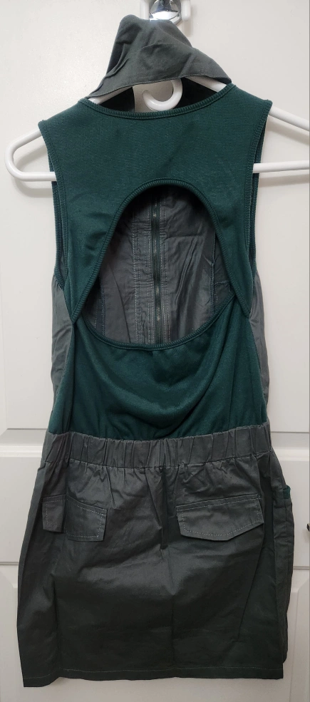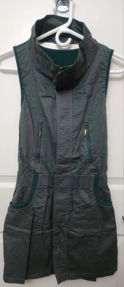 Dark green sleeveless vest dress. Features a front zipper, two zippered pockets, and a cinched waist. Open back detail. Good for layering. As shown in the third picture, one side touches the zipper is slightly discolored. The selling price is $10 due to the discolored. condition: like new, tried once no further negos, CASH only (price is firm) pet free and smoke-free home pick up ONLY in front of TCDSB final sale *It is available if you see the post with no indication of "reserved." Please do not ask. Msg me when you want it only πŸ™