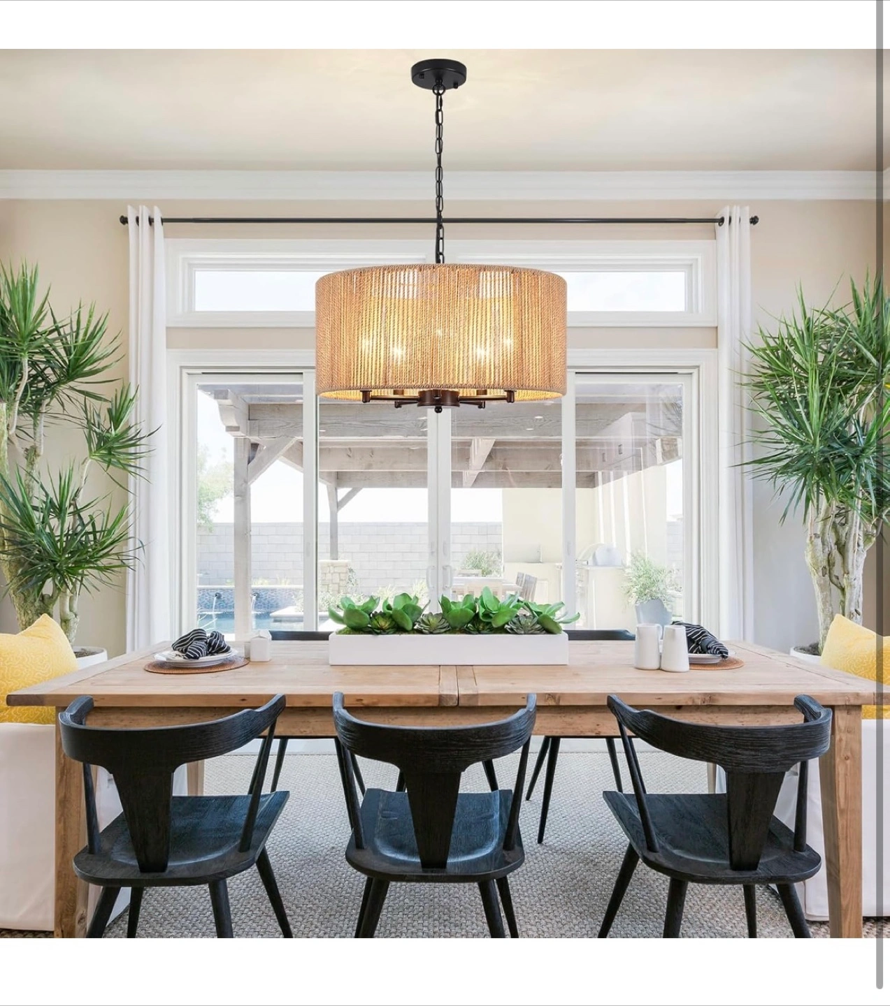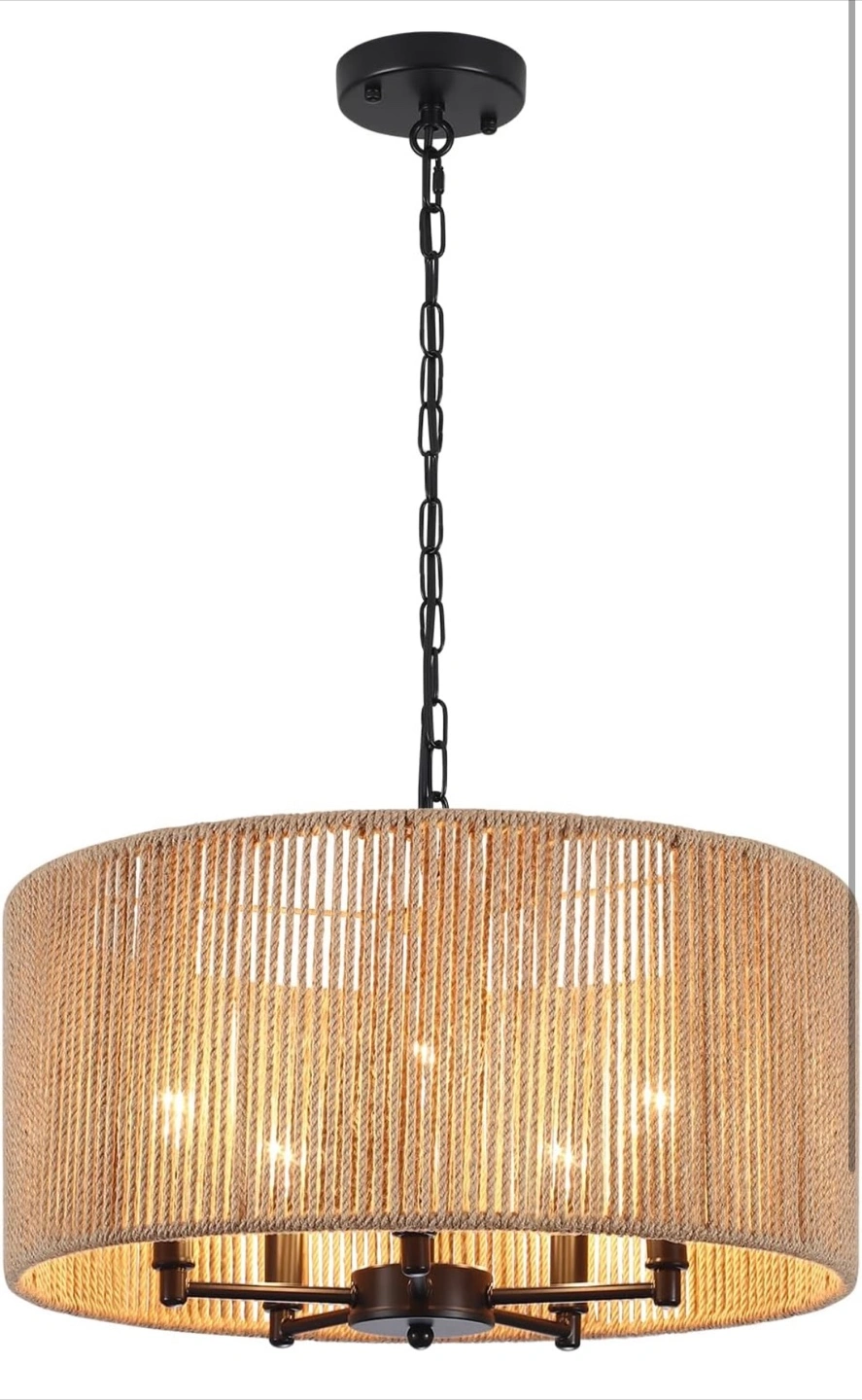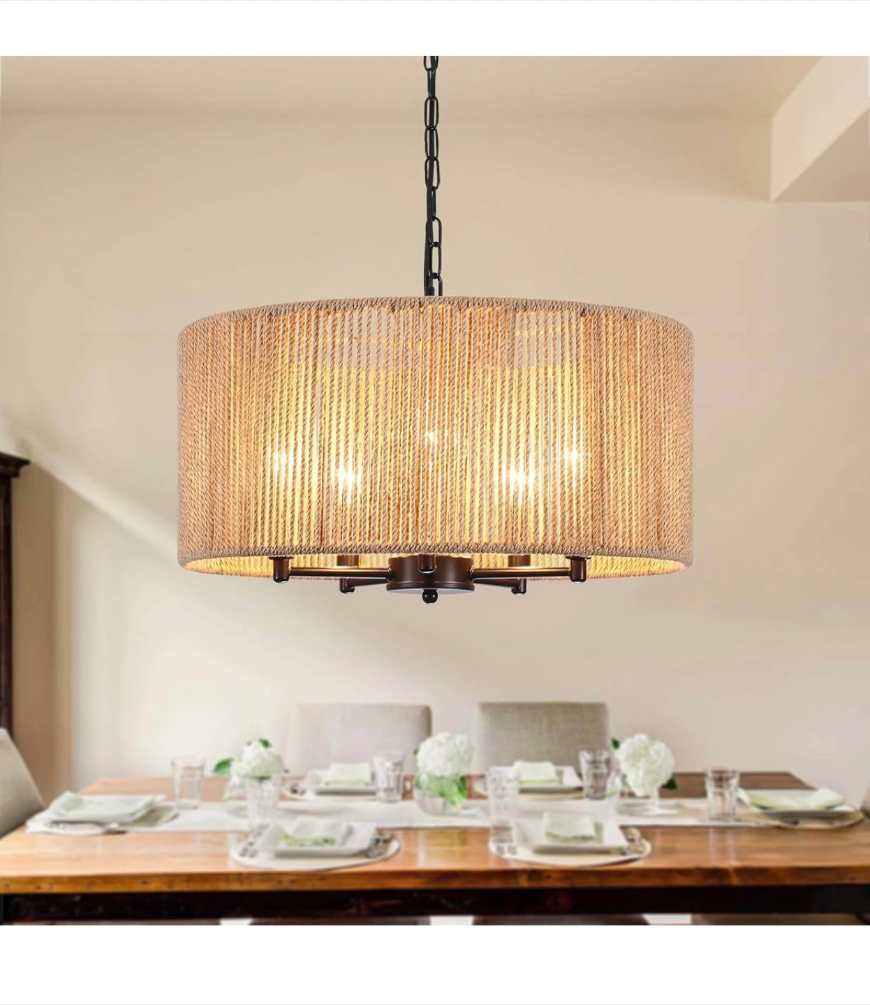 LASENCHOO 5 Lights Rattan Chandeliers Ceiling Lights, Dia 19.3" Boho Light Fixtures Ceiling Hanging Drum Farmhouse Chandelier for Dining Room Living Room Bedroom Staircase Kitchen, Height Adjustment
