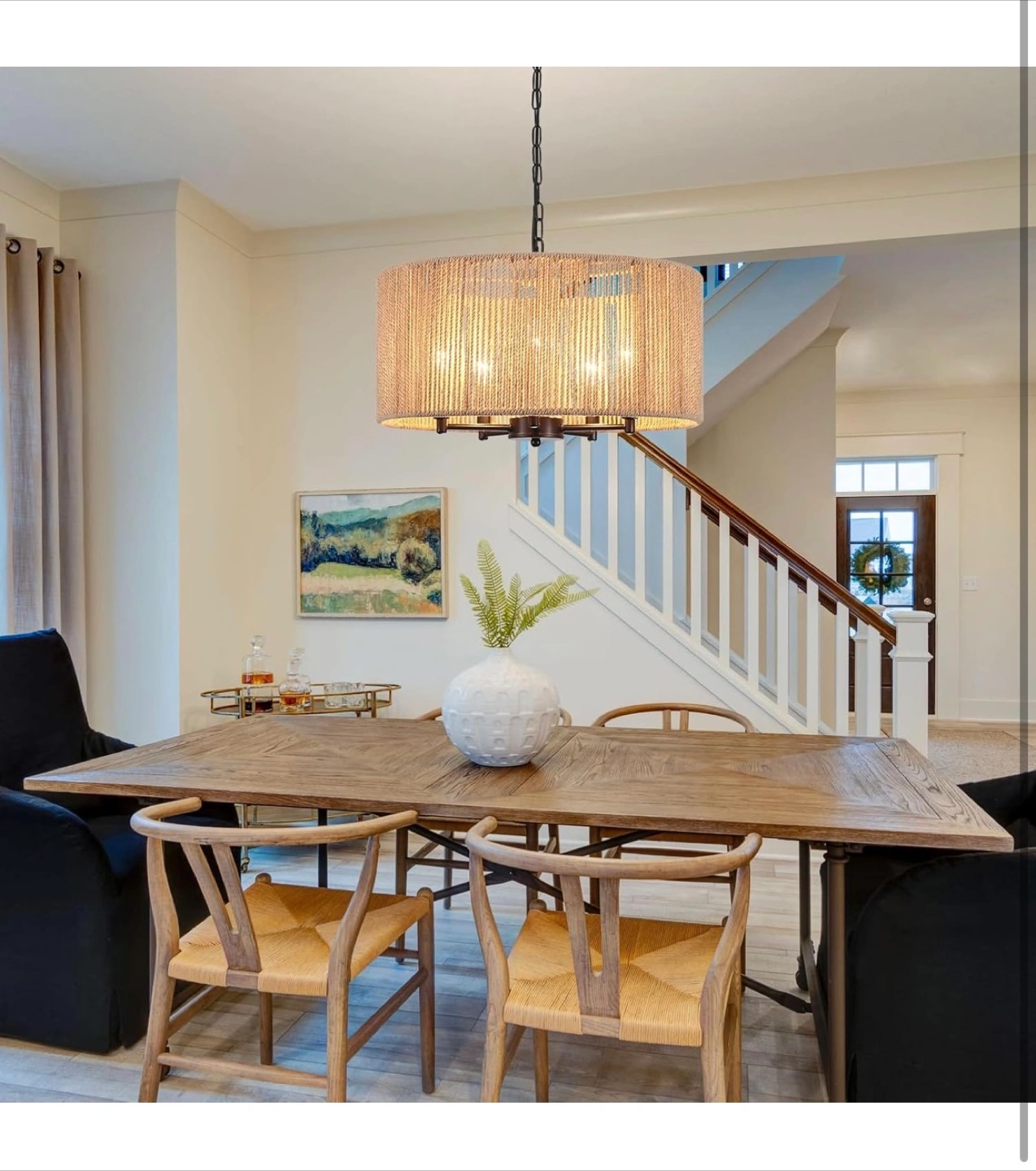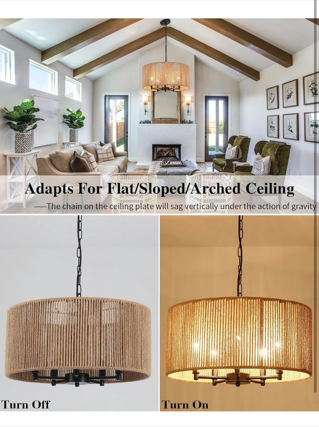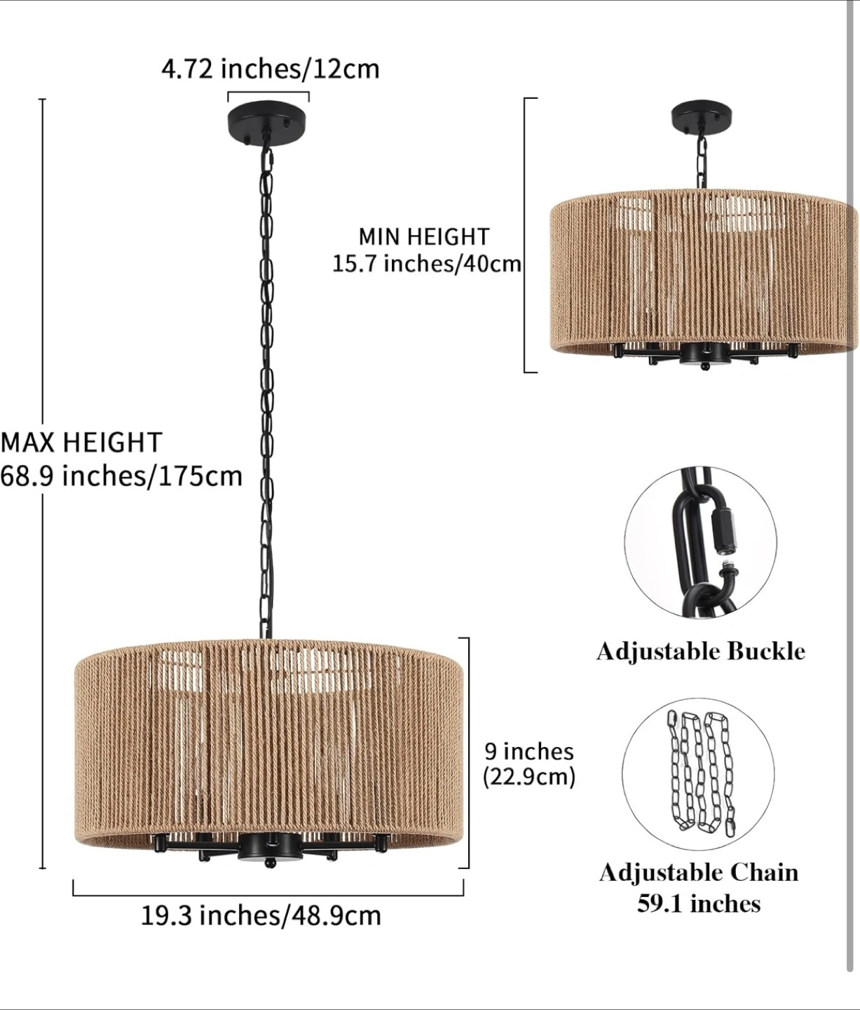Add a touch of rustic charm to your home with this rope-wrapped drum chandelier! It adapts for flat, sloped, or arched ceilings, and the height is adjustable. The dimensions are approximately 19.3 inches in diameter and 9 inches in height. The chain is adjustable up to 59.1 inches