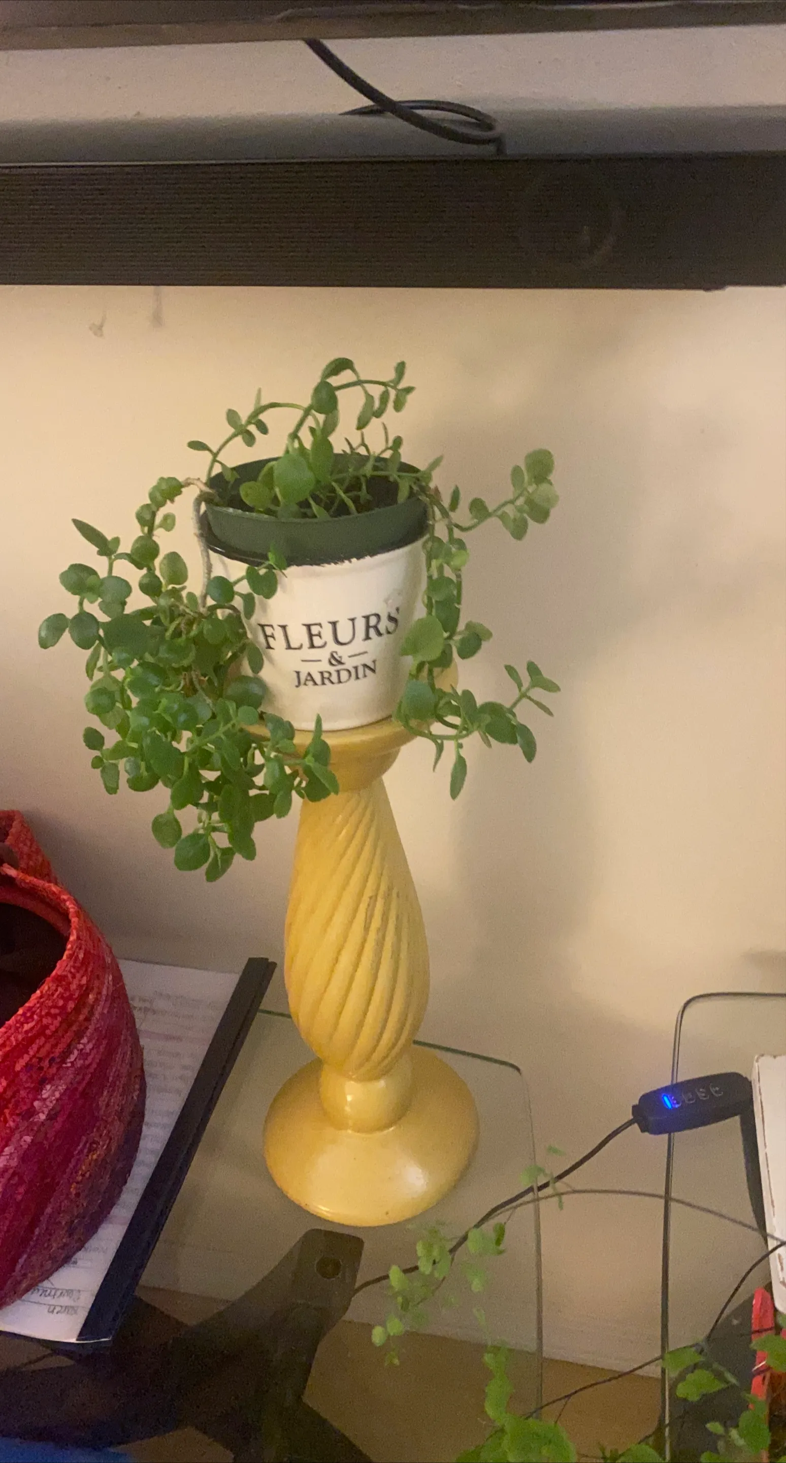 A cute little plant in a pot that says Fleurs & Jardin. It comes with a decorative yellow stand too, perfect for adding a touch of green to your space