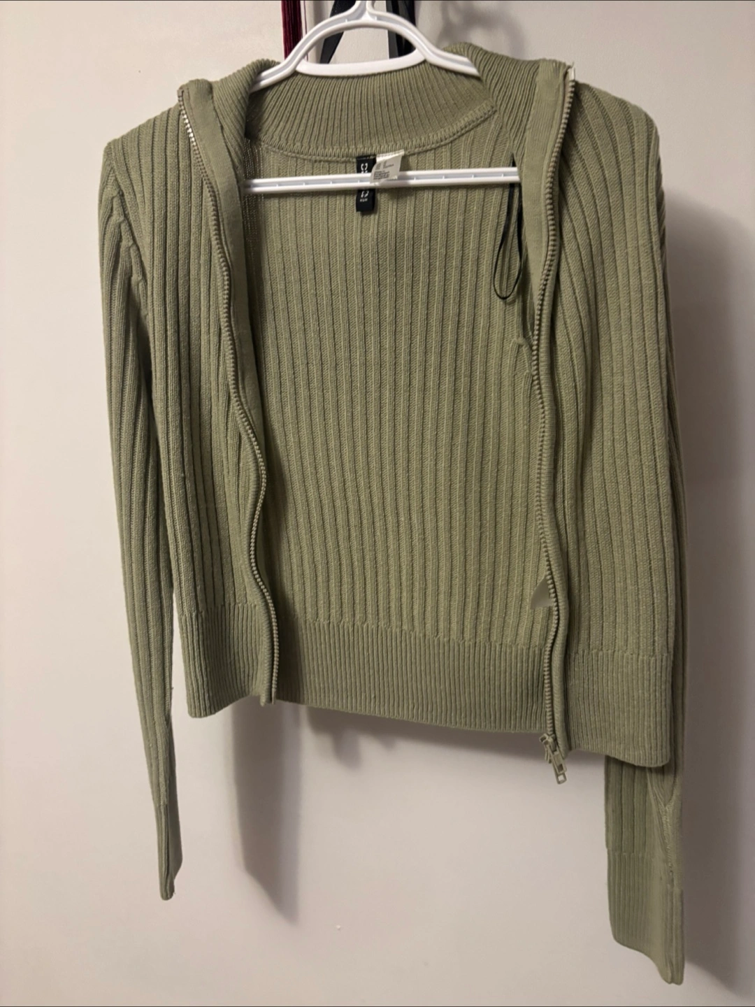 Selling a cute H&M knit zip-up hoodie in a lovely olive green colour. It's in great condition and perfect for layering!