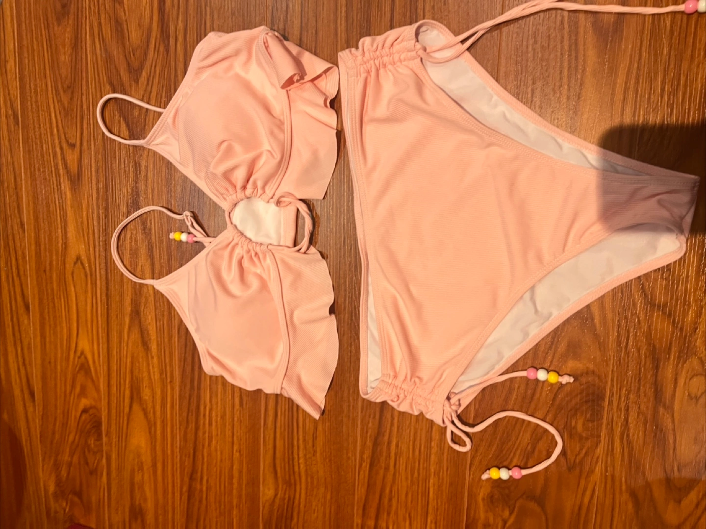 57Selling a cute pink two-piece swimsuit! It features a unique design with ruffle detailing on the top and adjustable ties on both the top and bottom. Perfect for a day at the beach or lounging by the pool