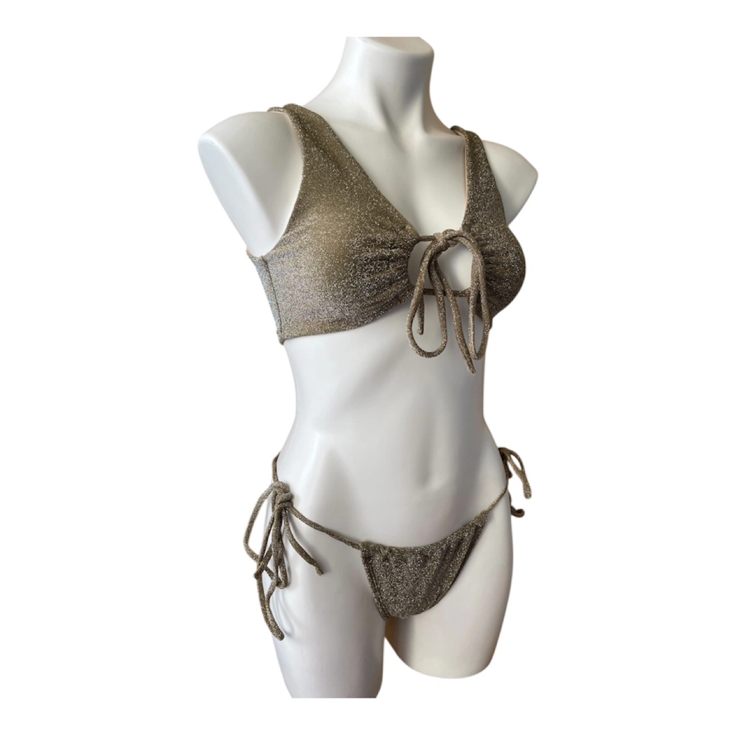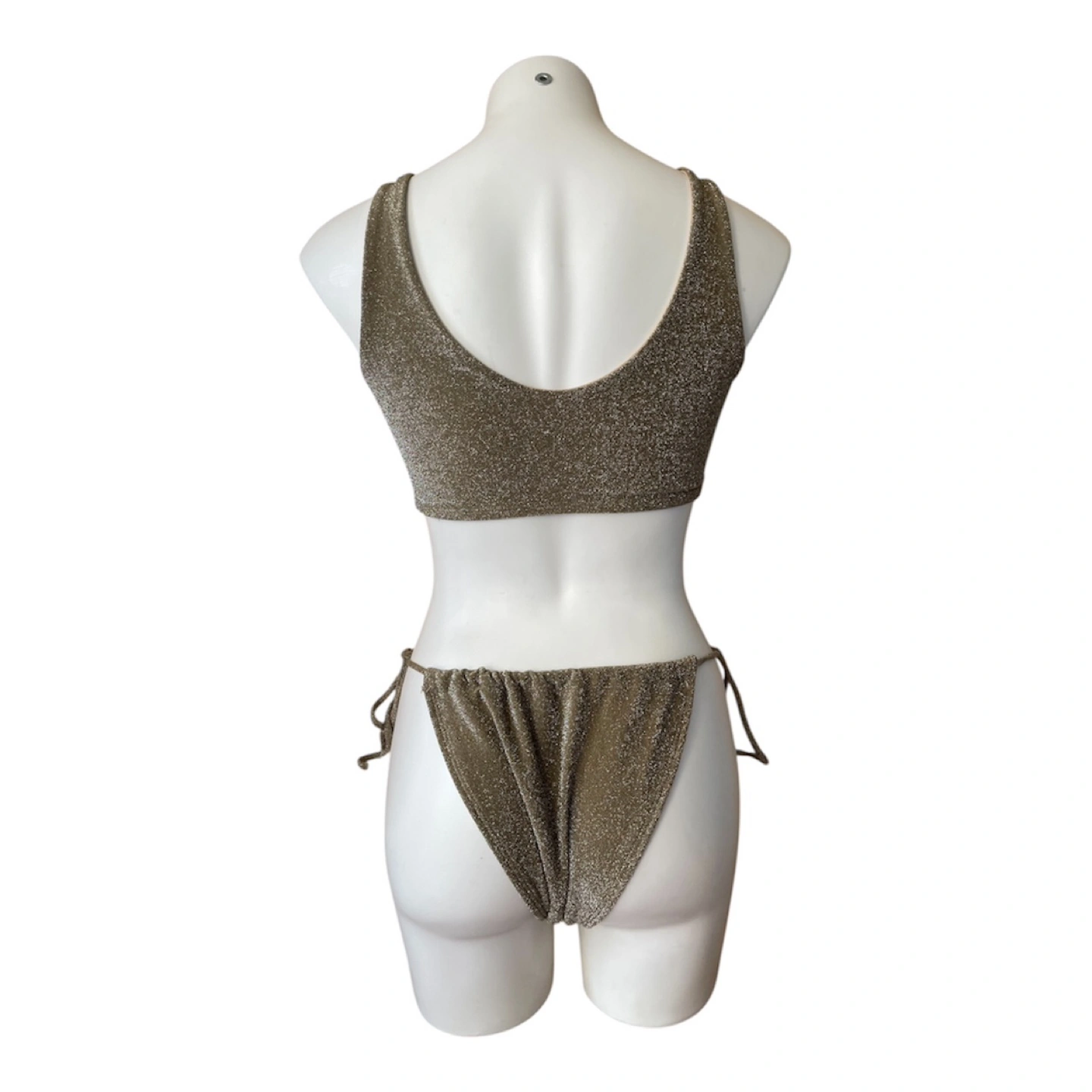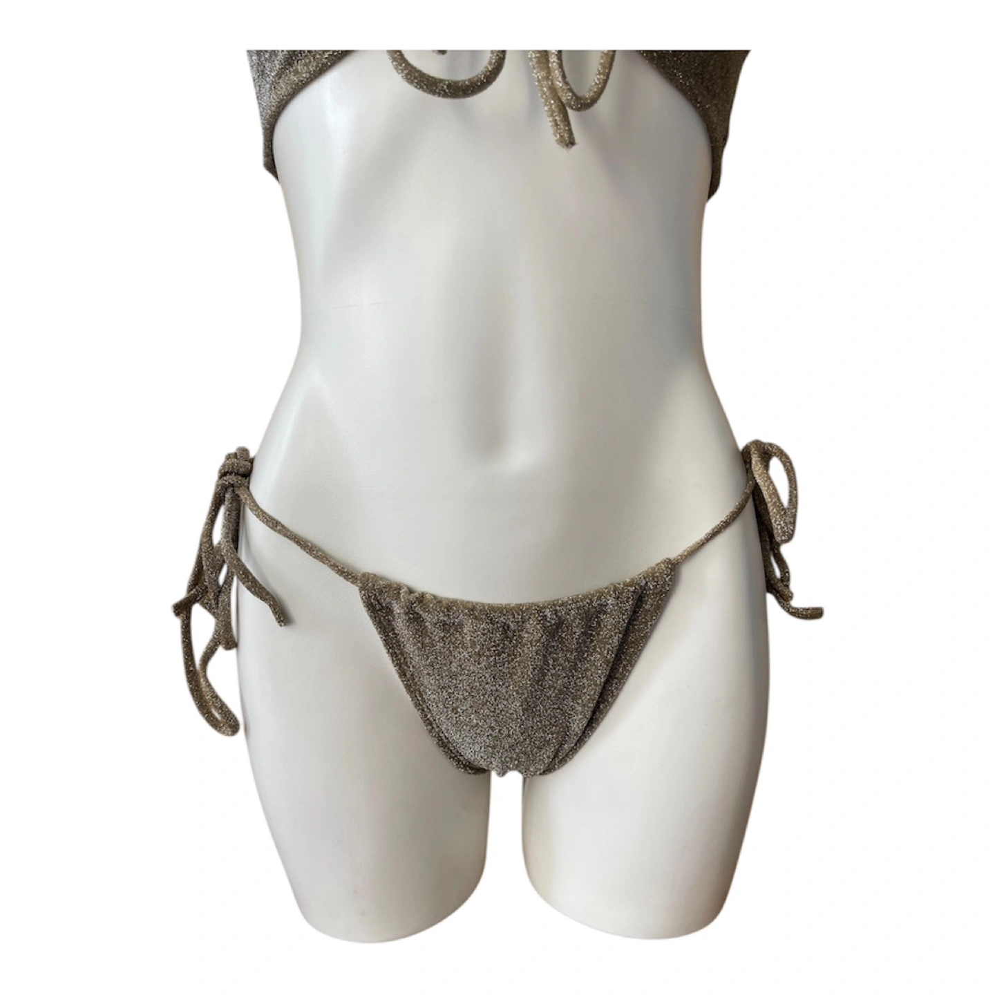 NWT RARE Vintage 2000s Y2K Bikini Set Halter Top Brazilian String Bottoms Glitter Gold Medium