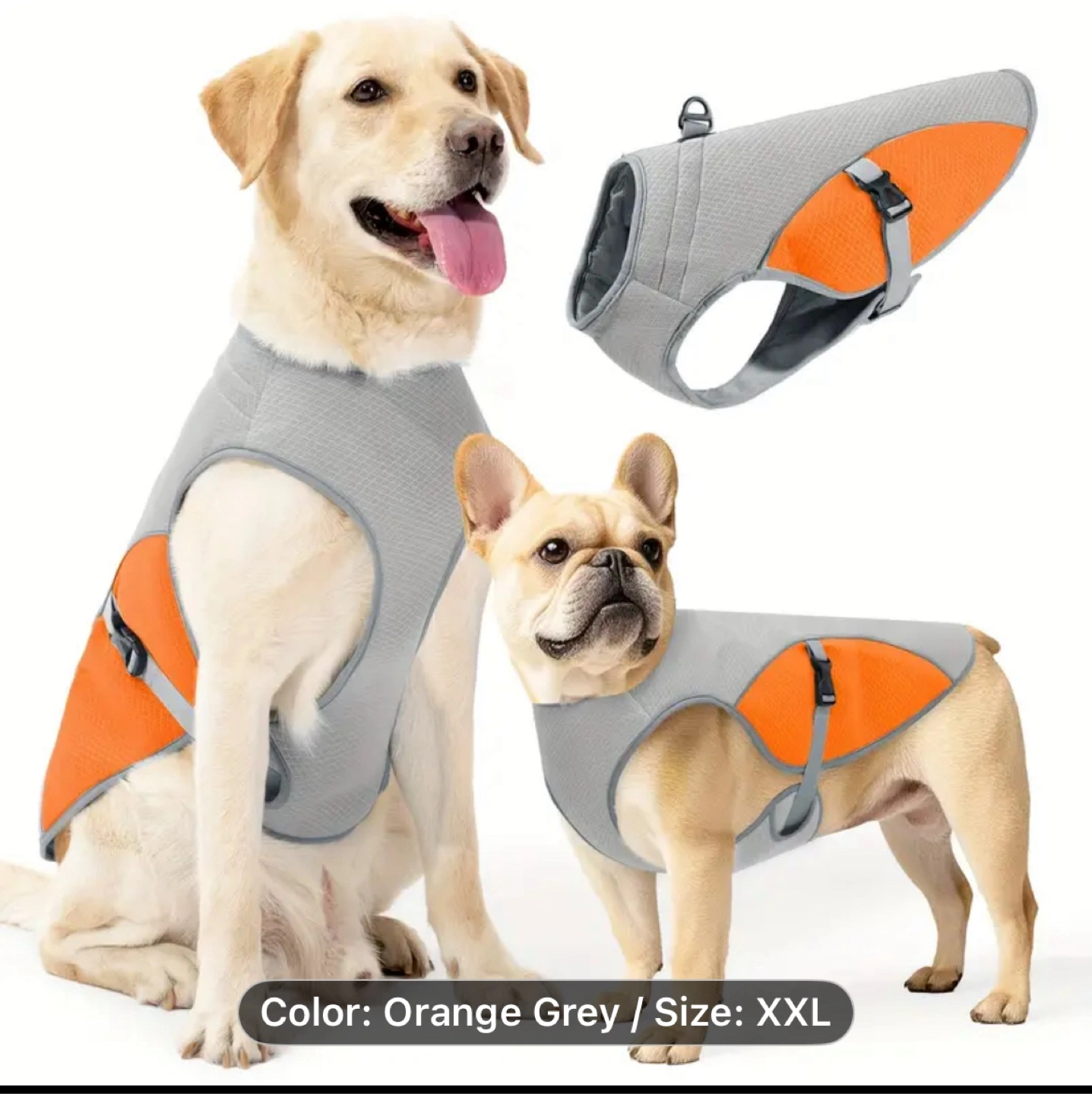 Keep your furry friend cool this summer with this orange and grey dog cooling vest! It's size XXL, perfect for larger dogs with a chest size of 27-33 inches and a back length of 23 inches. It helps regulate your dog's temperature, especially on hot days