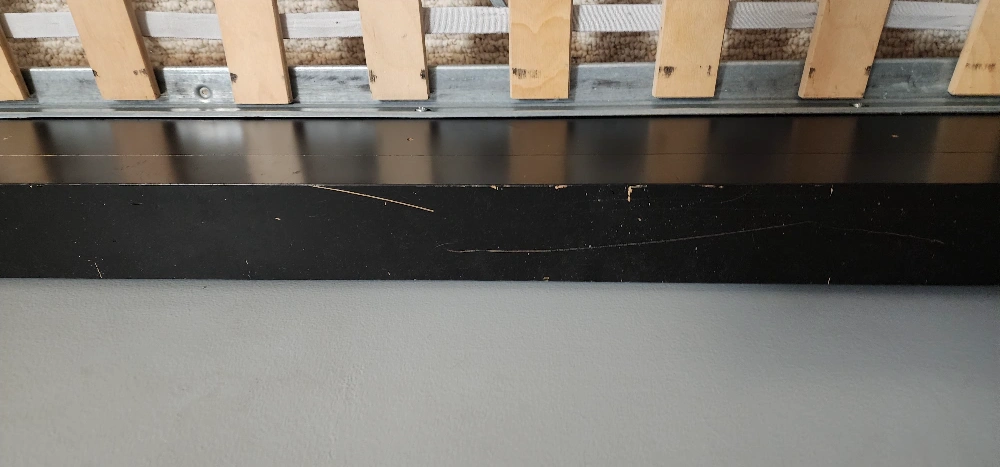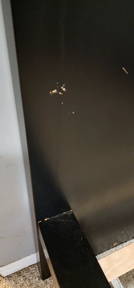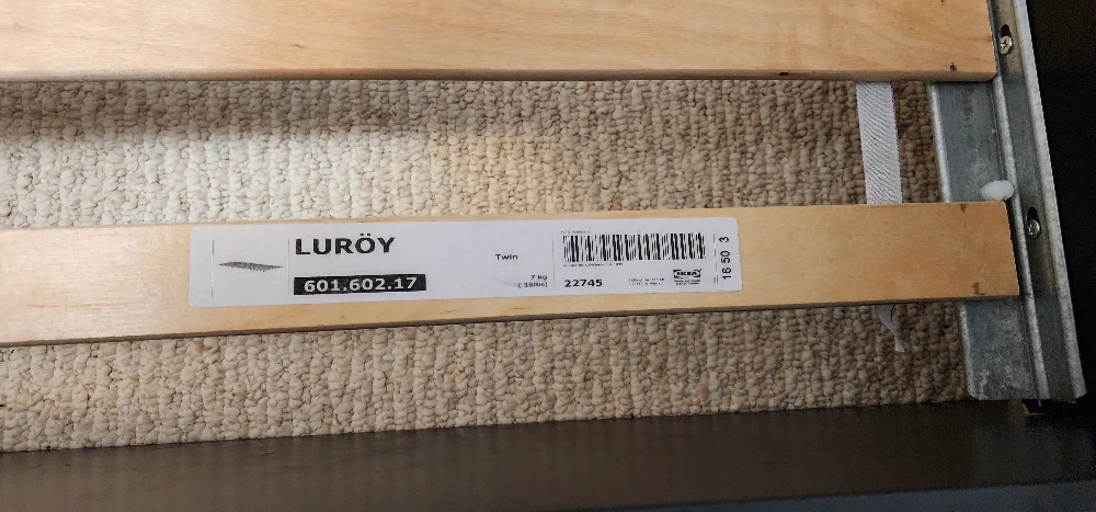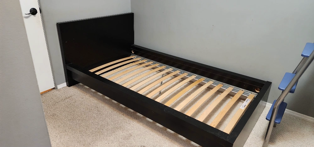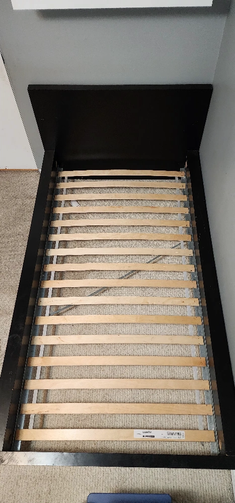 Selling an IKEA black MALM twin bed frame with slats included. There are some signs of wear and tear, as shown in the photos, but it's still in good working condition. The bed frame includes the Luroy slatted bed base.