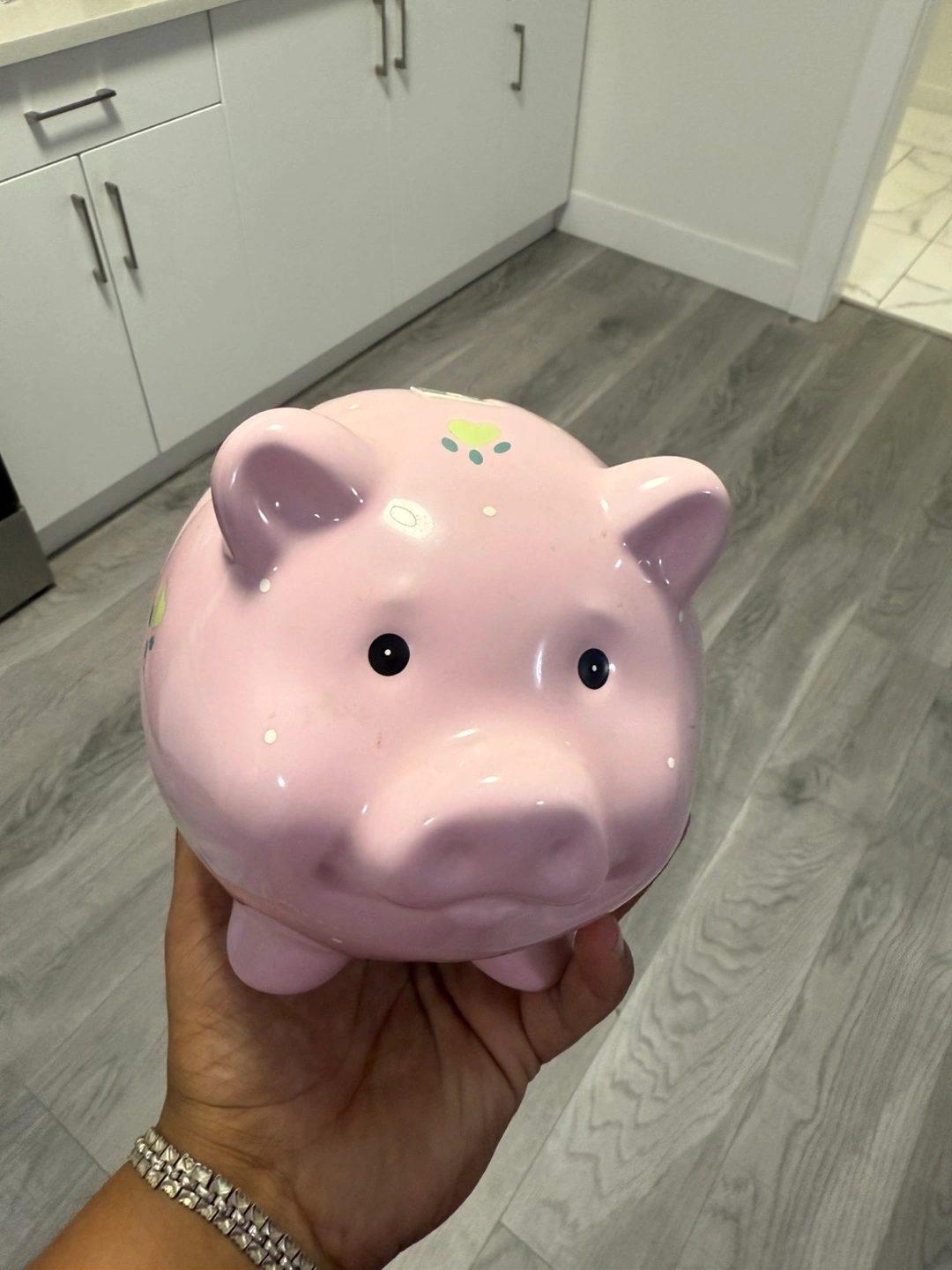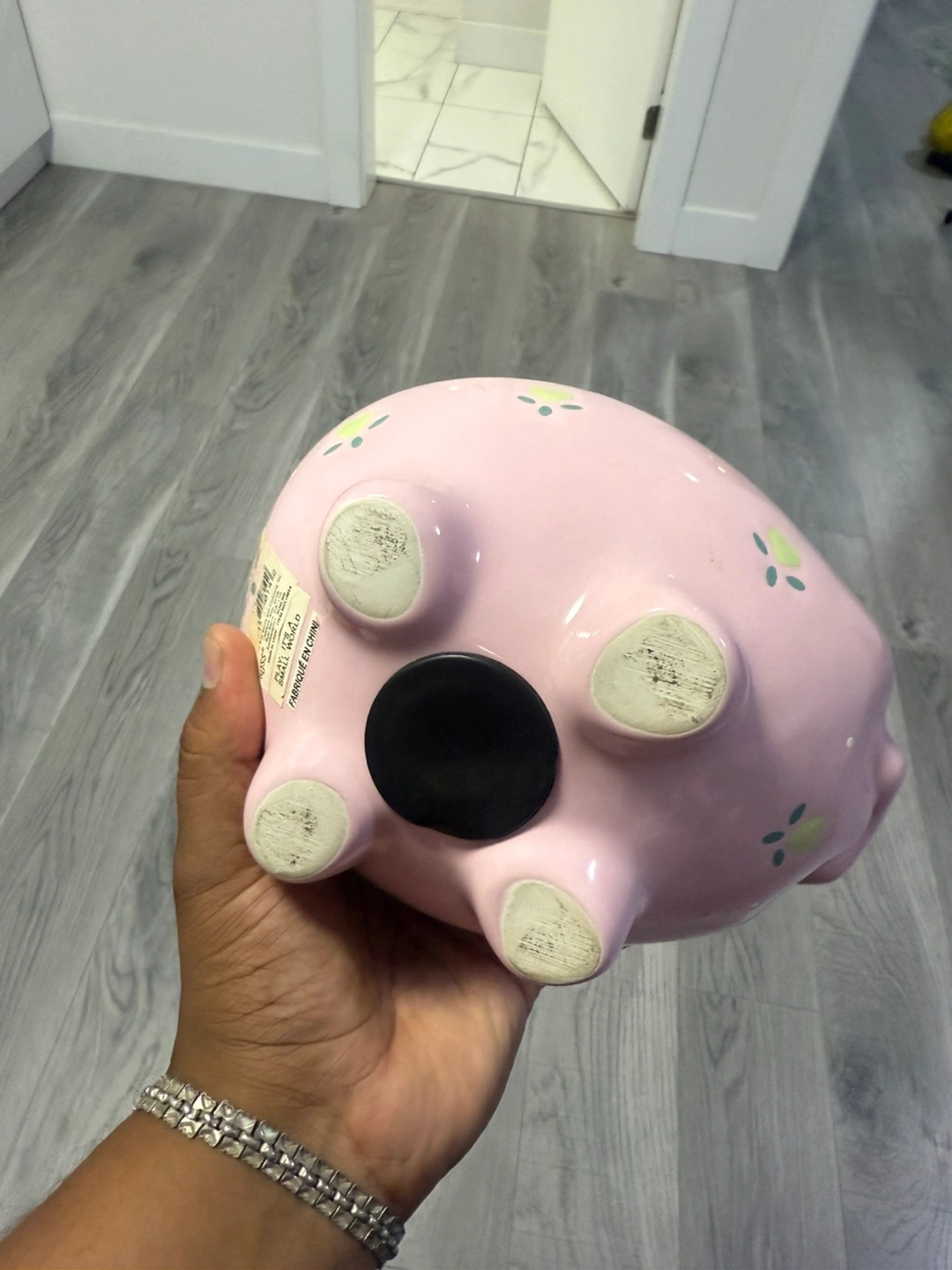 Selling a cute pink piggy bank! It has little green floral designs and a coin slot on top. It's in great shape and ready to help you save up!