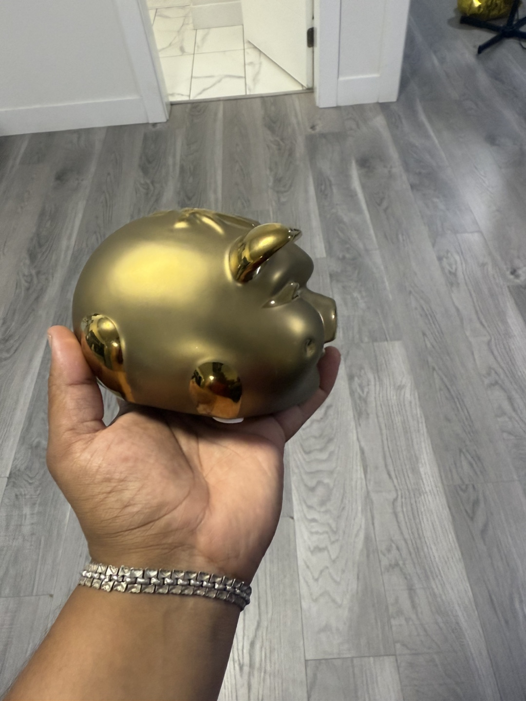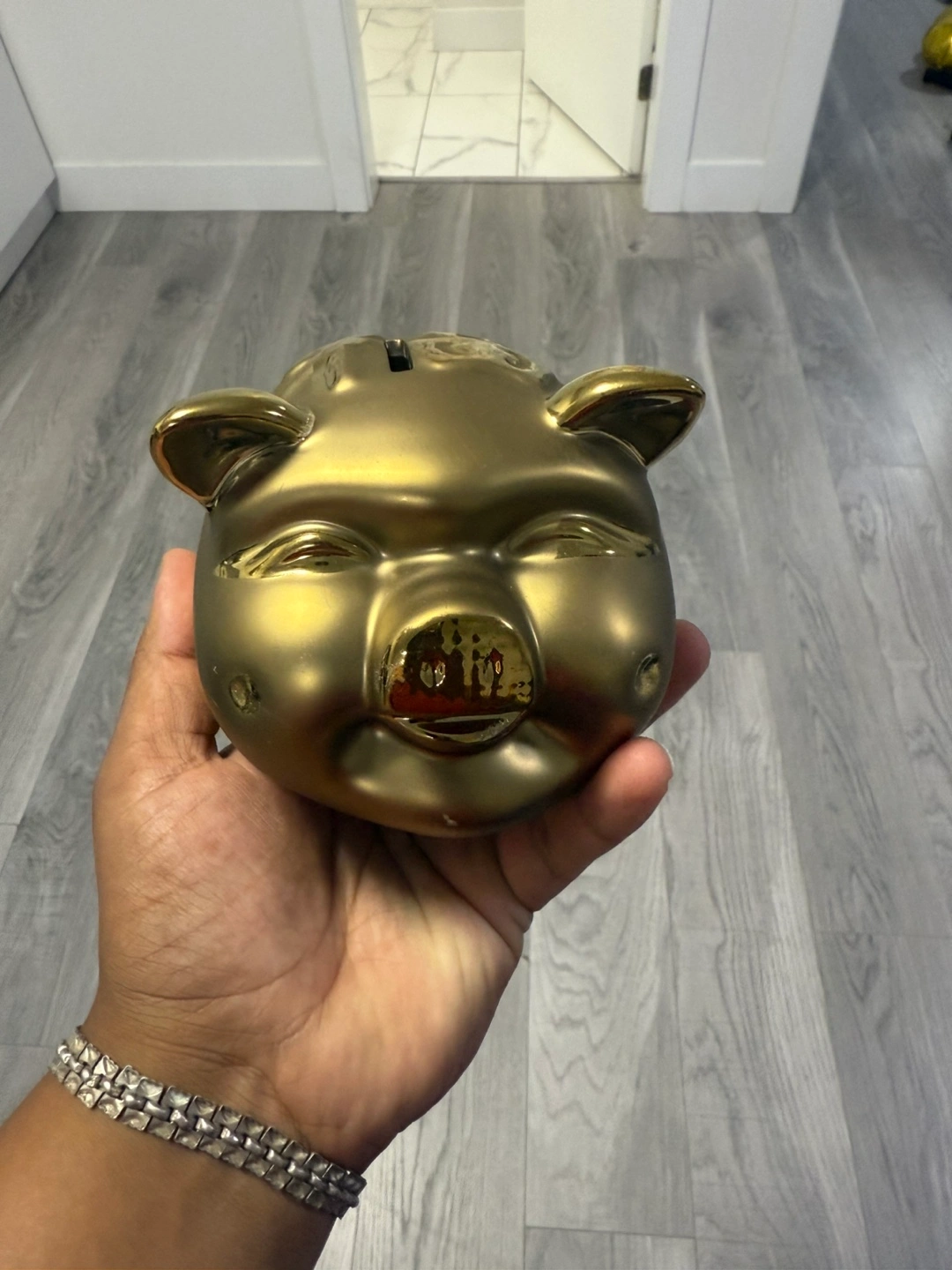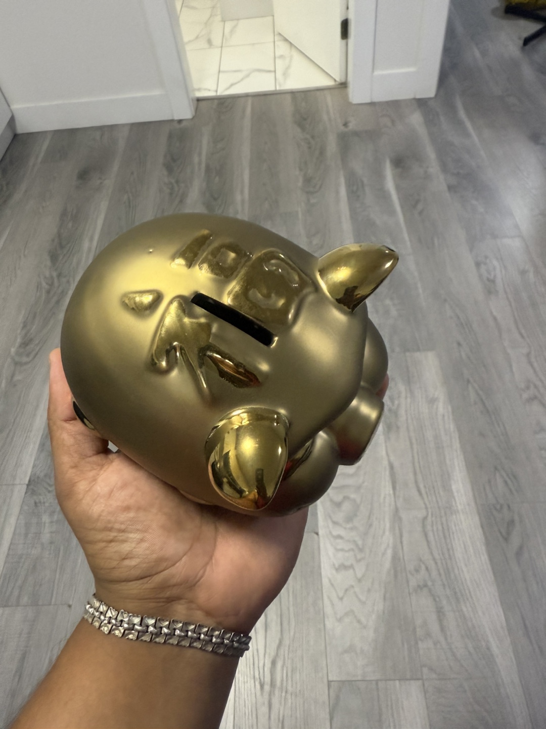 Selling a cute gold piggy bank! It's shaped like a pig's head and would look great in a kid's room or anywhere you want to save up your change
