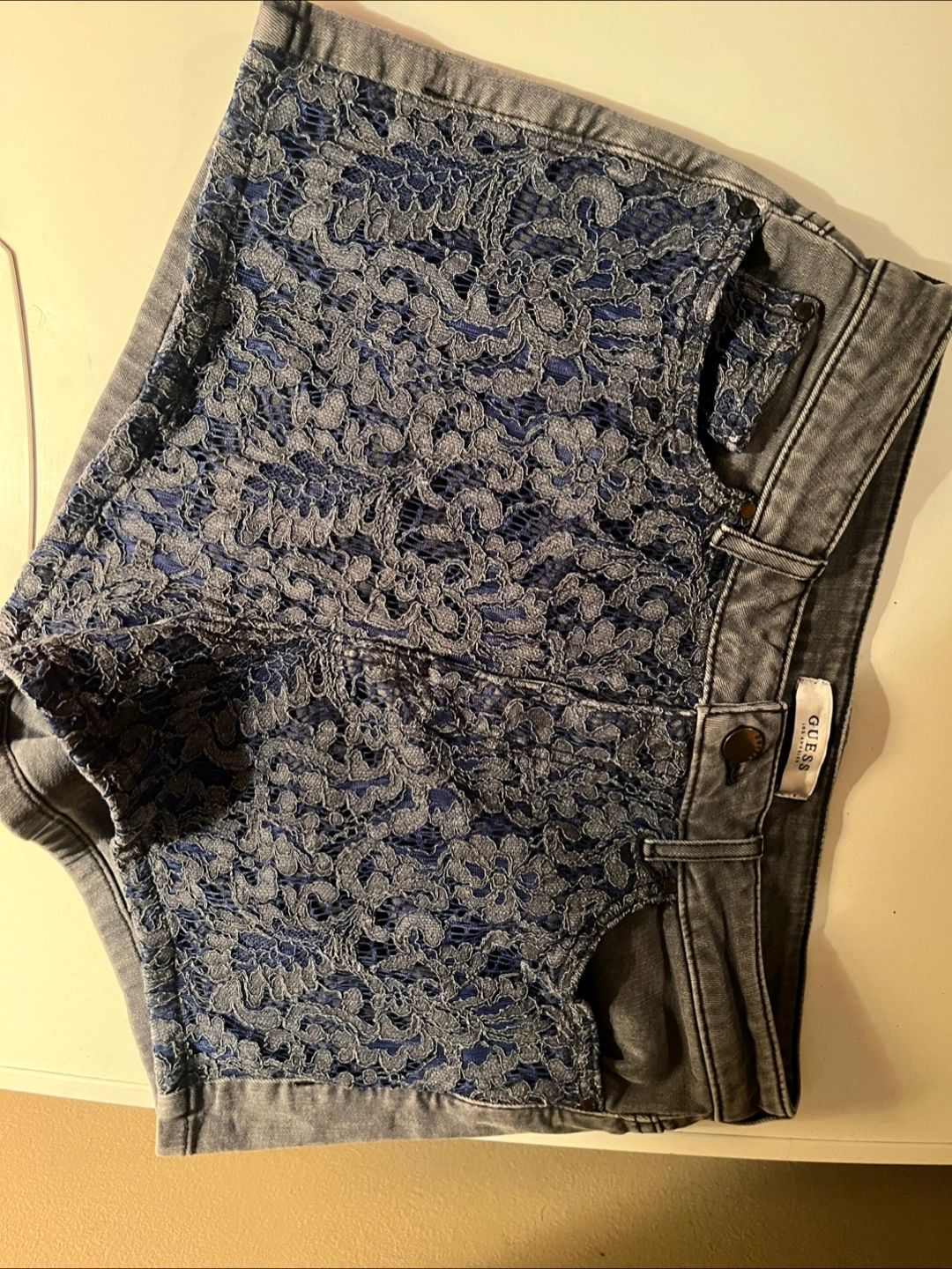 Cute Guess denim shorts with a unique lace design! They're a size 30 and in great condition. Perfect for summer!