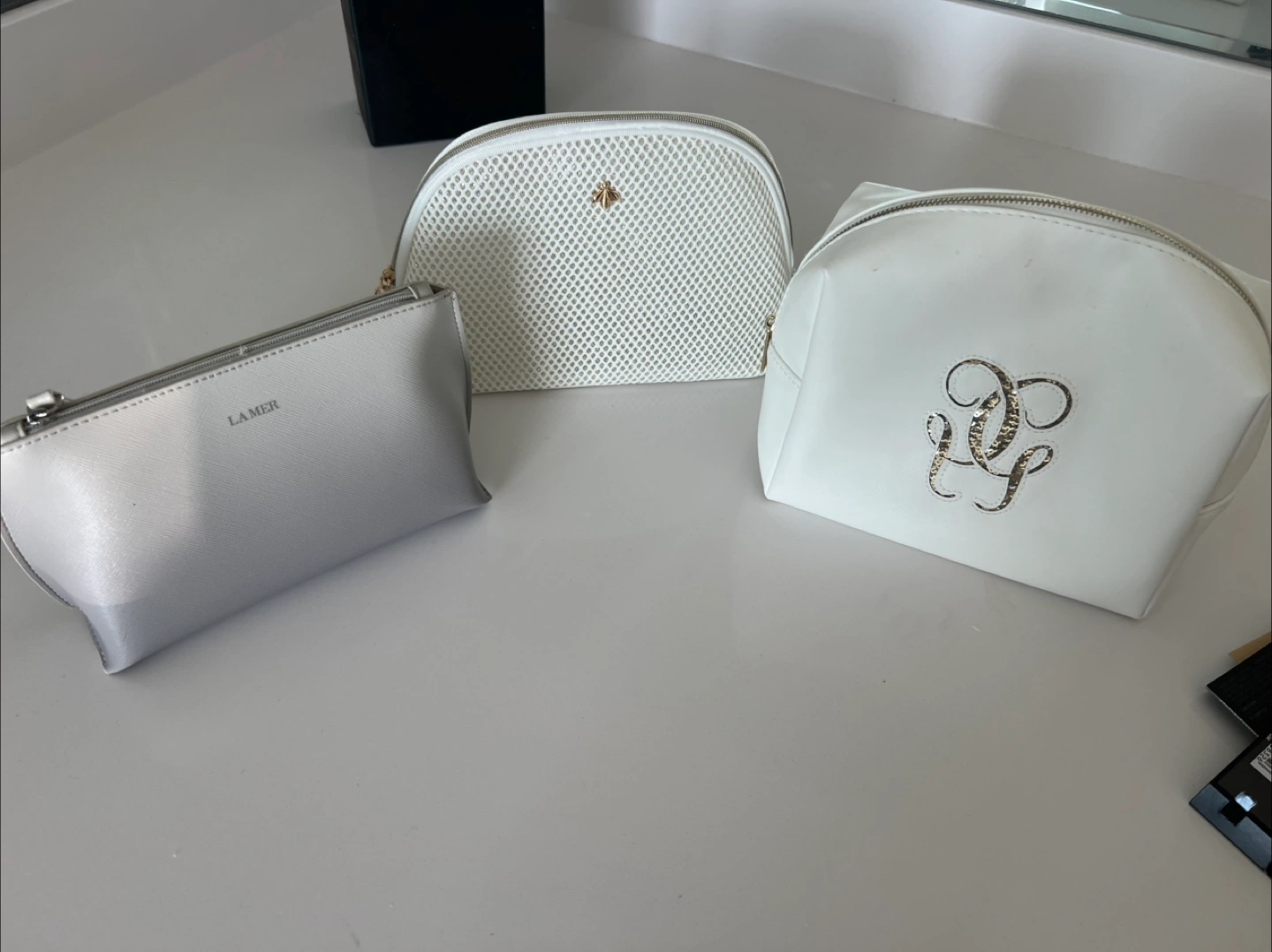 Selling a few cosmetic bags. There is a La Mer bag in a light grey colour. There is also a white mesh bag with a gold emblem and a white bag with an ornate design.