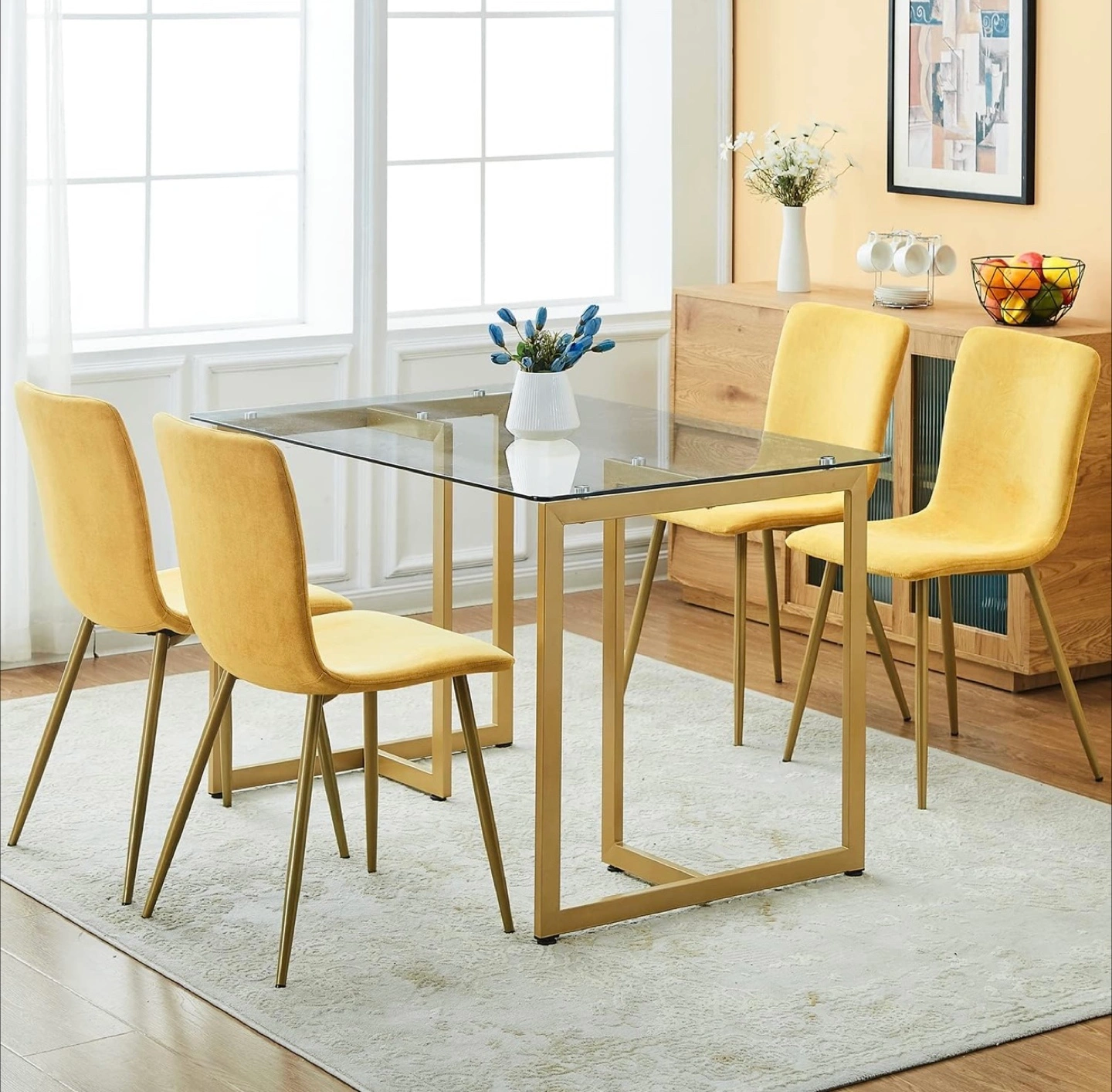 Selling a glass dining table with four stylish yellow chairs. The chairs feature a brushed fabric that’s soft and comfy, along with metal legs designed for strong load-bearing. They can support up to 250 pounds! The rubber mats on the legs are wear-resistant and non-slip, perfect for any floor.