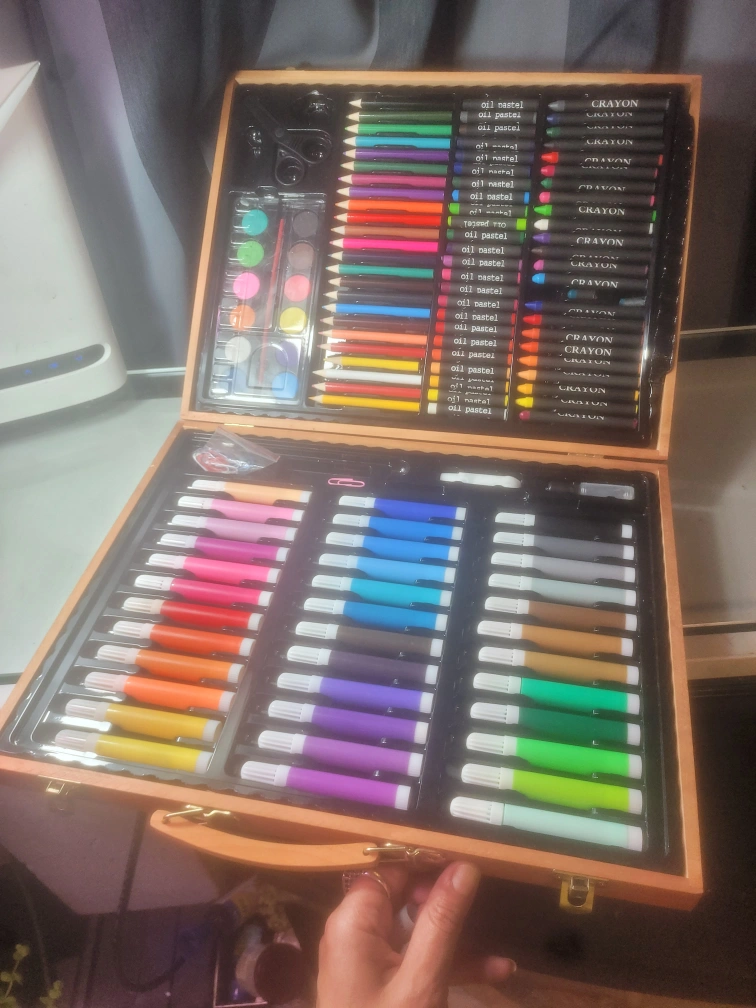Selling a complete art set in a wooden case! It includes crayons, oil pastels, watercolor paints, and markers. Perfect for budding artists or anyone who enjoys creating art!