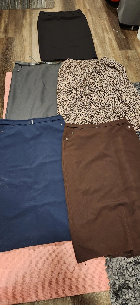 I'm offering a collection of brand new women's pencil skirts in various colours including black, grey, blue and brown, perfect for a professional or business casual wardrobe. These skirts are brand new and ready to wear. I estimate the value based online at $15 each, or $70 for all five