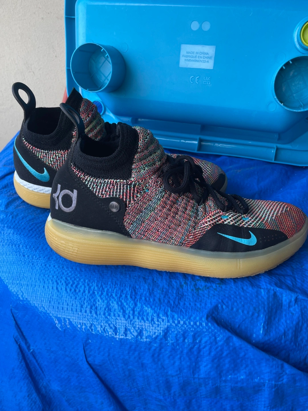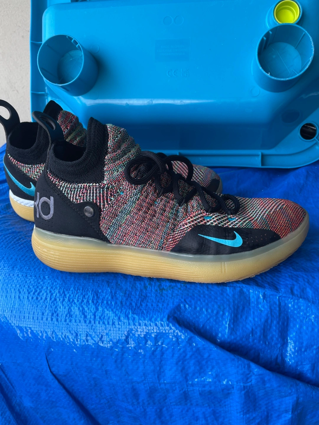Selling a pair of Nike KD11 basketball shoes! They feature a unique multi-coloured knit upper with black accents and a light blue Nike swoosh. The soles are a gum colour. Great for on the court or casual wear!