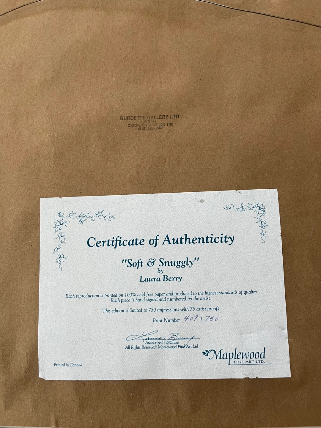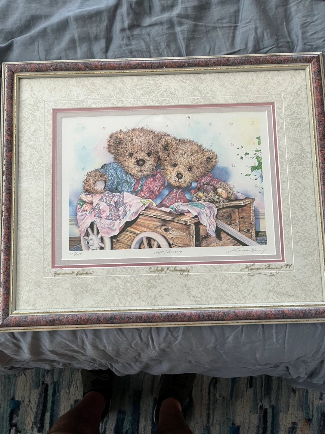 A charming framed print by Laura Berry titled "Soft & Snuggly". It features a delightful scene of teddy bears and a wooden cart. This edition is limited to 750 impressions with 75 artist proofs, print number 409/750. Comes with a Certificate of Authenticity from Burdette Gallery Ltd.