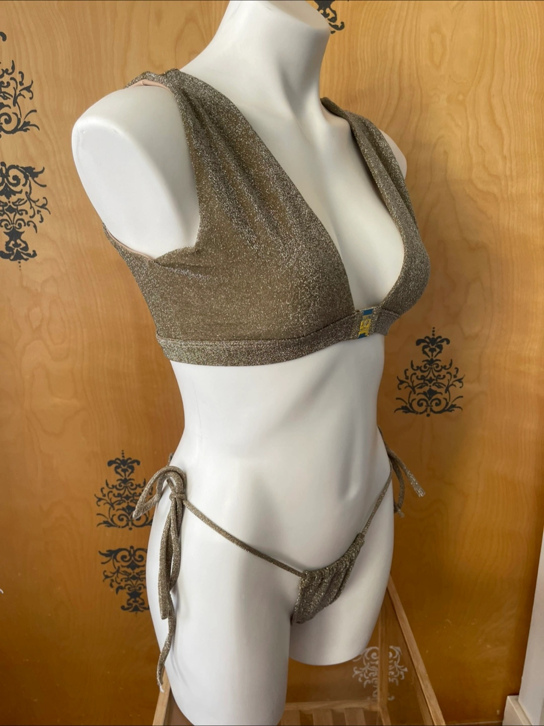 NWT RARE Vintage 2000s Y2K Bikini Set Halter Top Brazilian String Bottoms Glitter Gold M/L