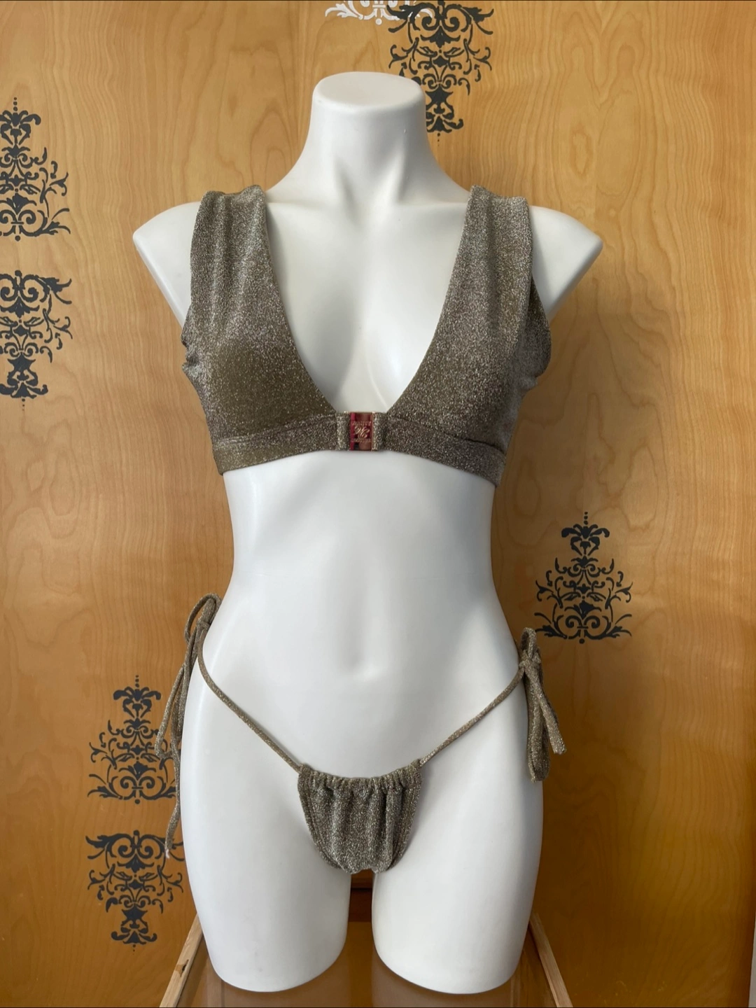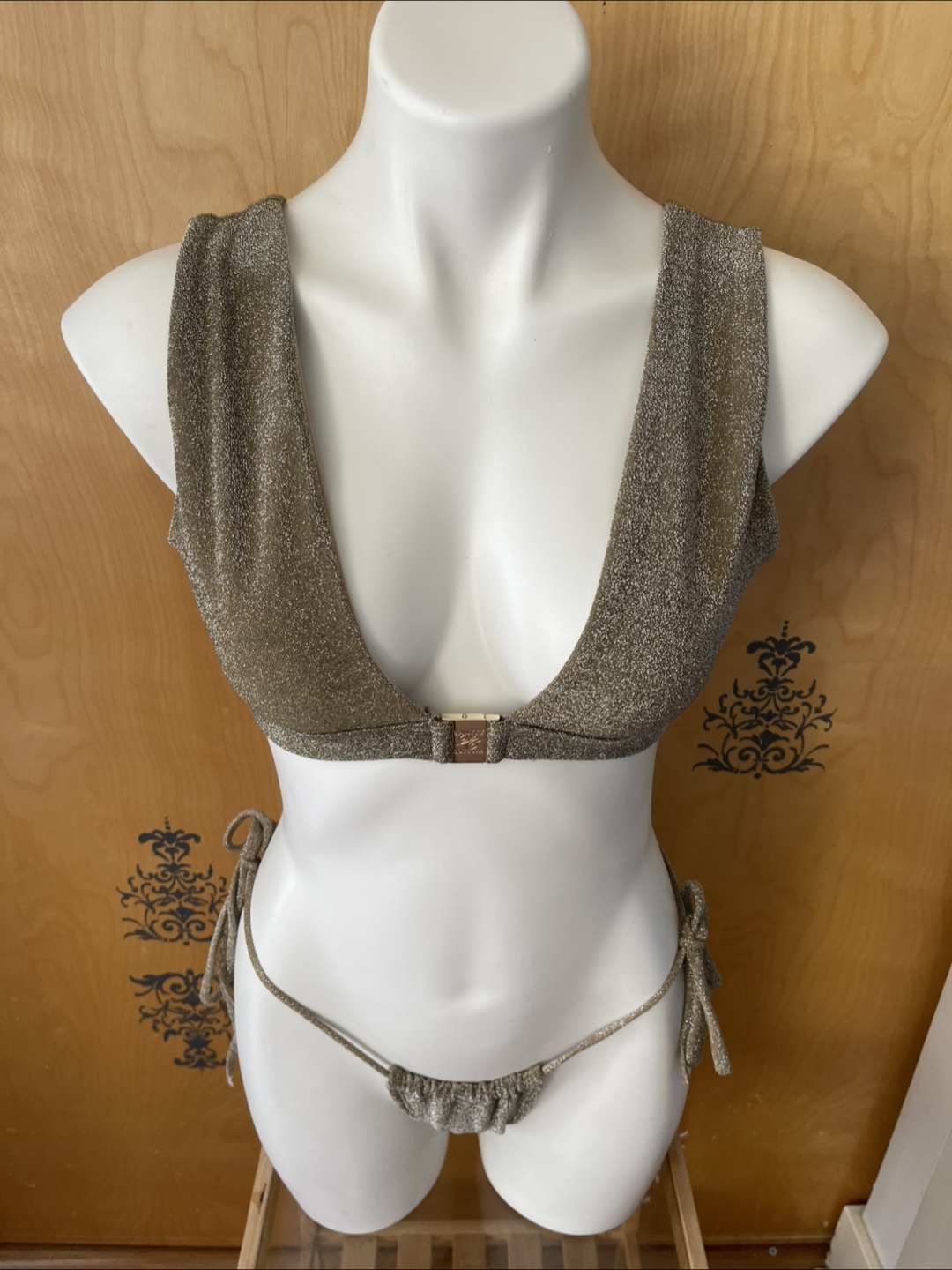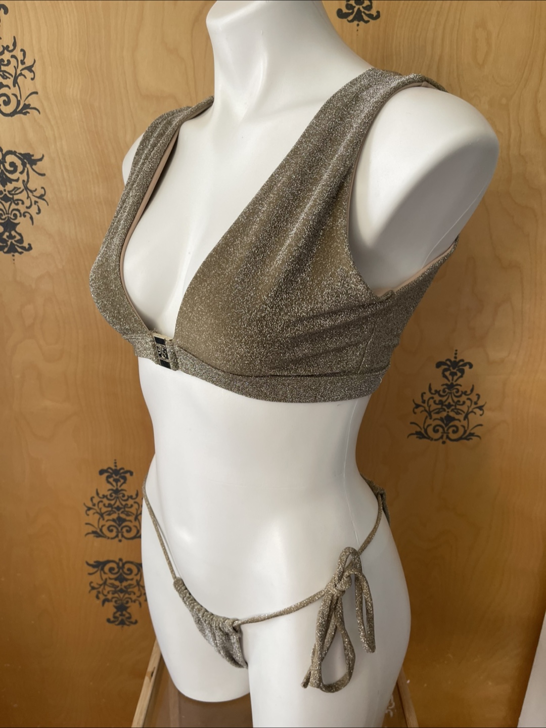 NWT RARE Vintage 2000s Y2K Bikini Set Halter Top Brazilian String Bottoms Glitter Gold Medium