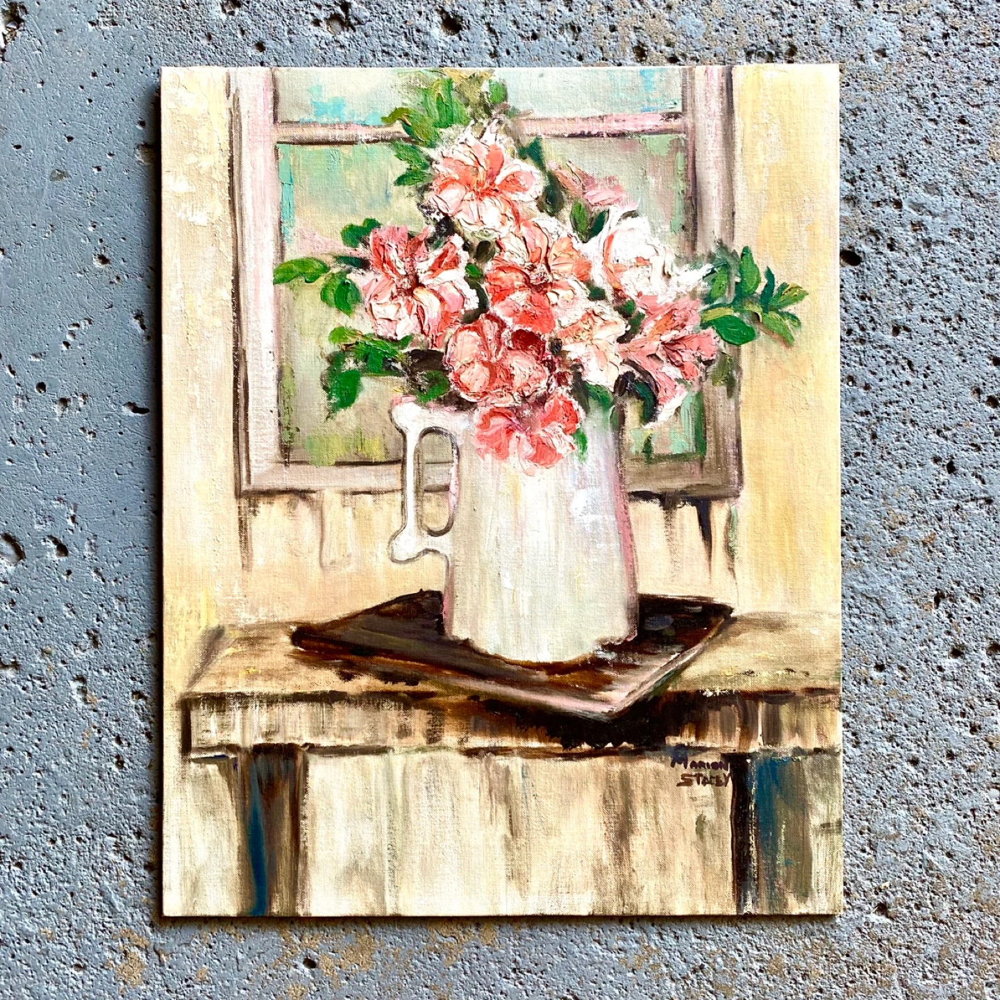 Vintage unframed original still life painting on board signed Marion Stacey.