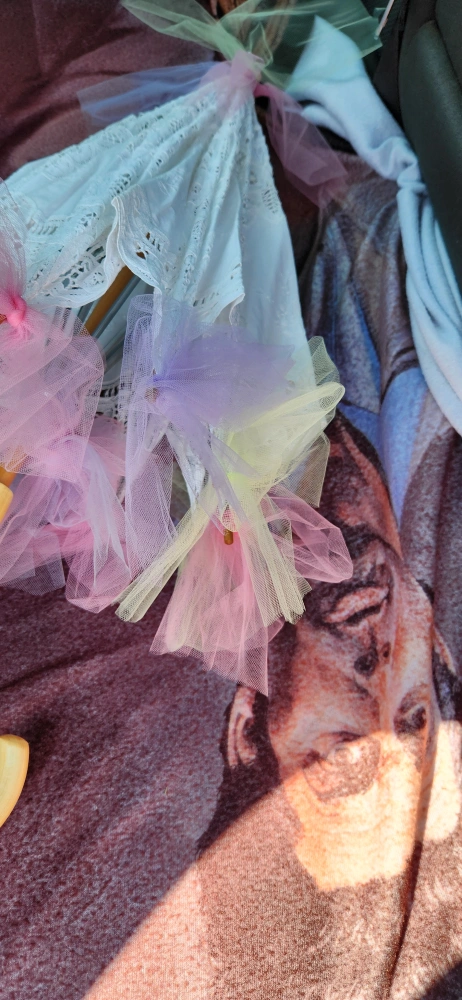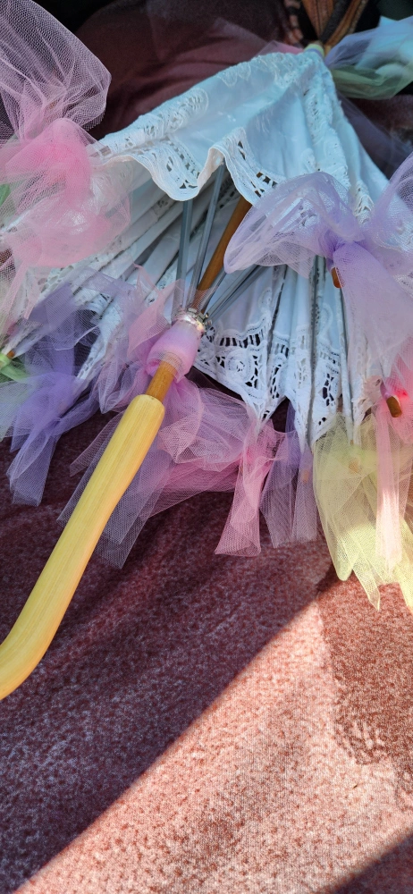 Selling a decorated parasol. It has a white lace canopy and is adorned with colourful tulle decorations. Perfect for a special occasion or as a unique decorative piece!