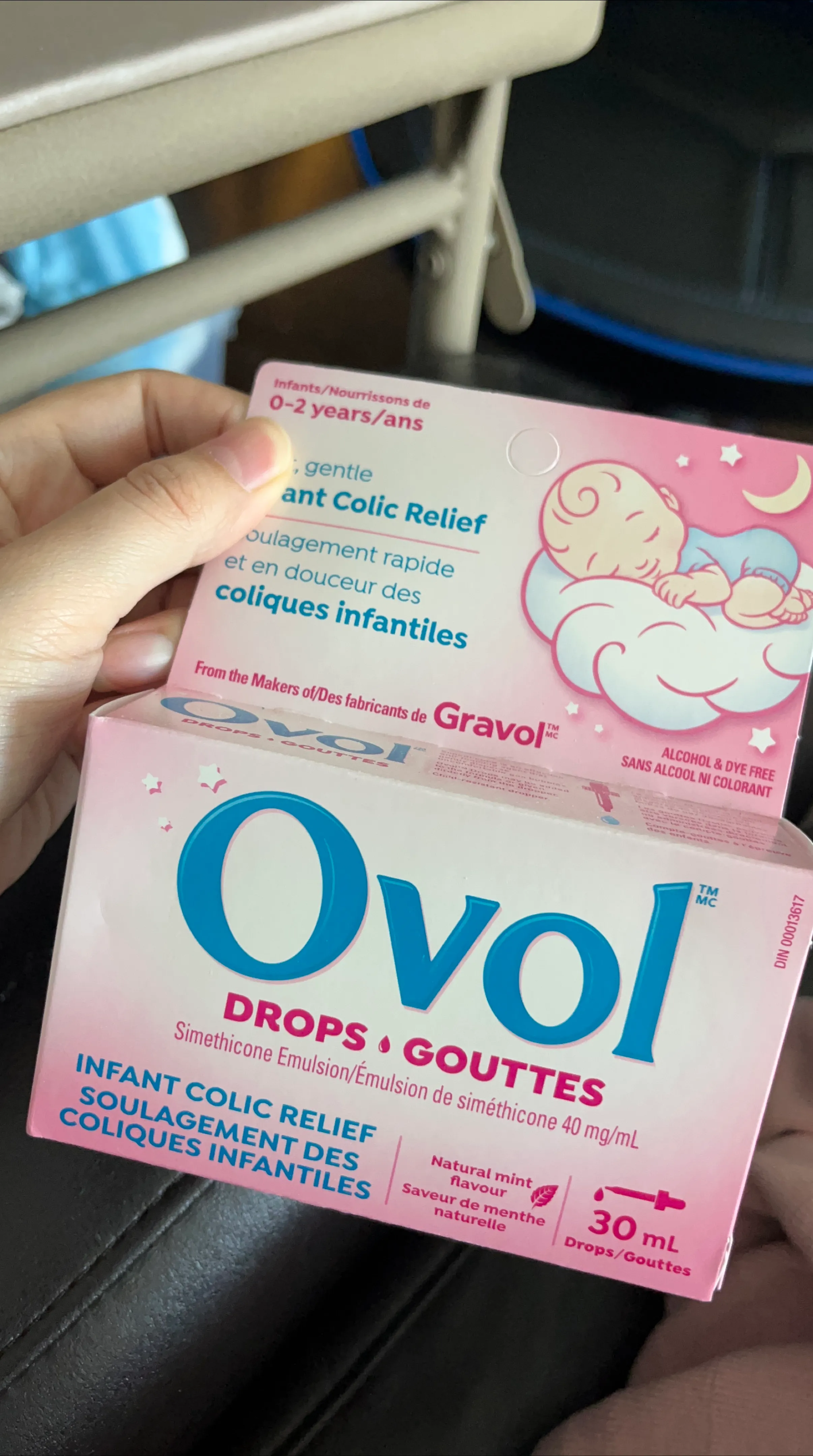 Selling a box of Ovol Infant Colic Relief Drops, perfect for little ones aged 0-2 years. These drops provide gentle and rapid relief from infant colic. From the makers of Gravol, it's alcohol and dye-free. It contains simethicone emulsion at 40 mg/mL with a natural mint flavour. Each bottle contains 30 mL of drops