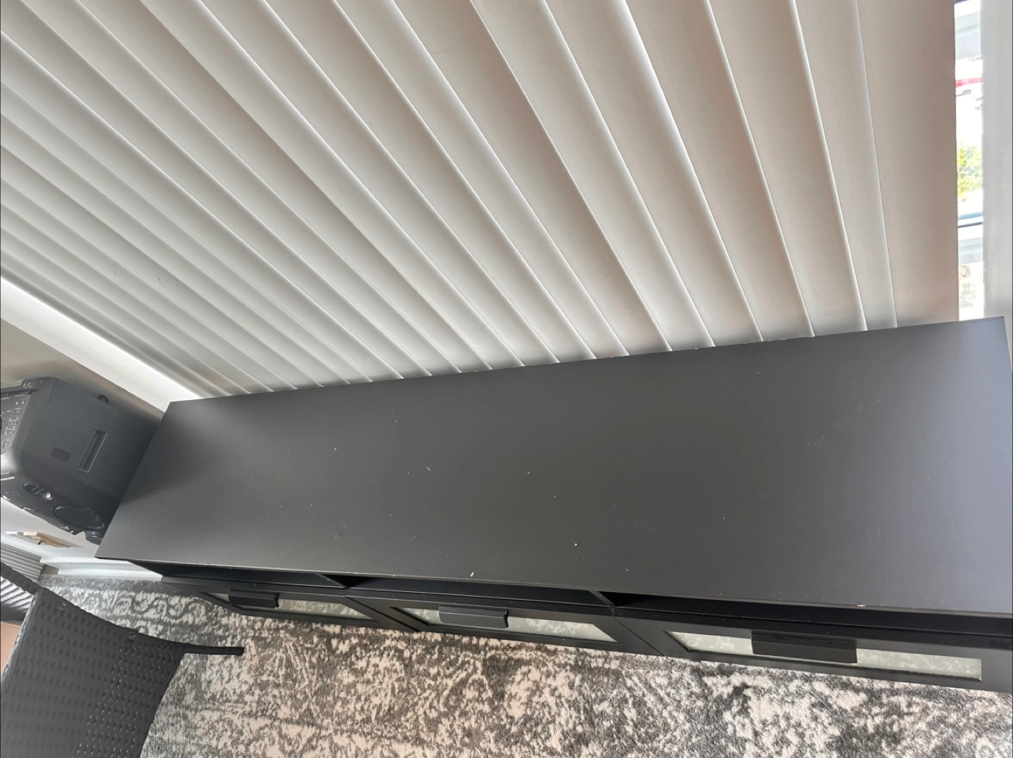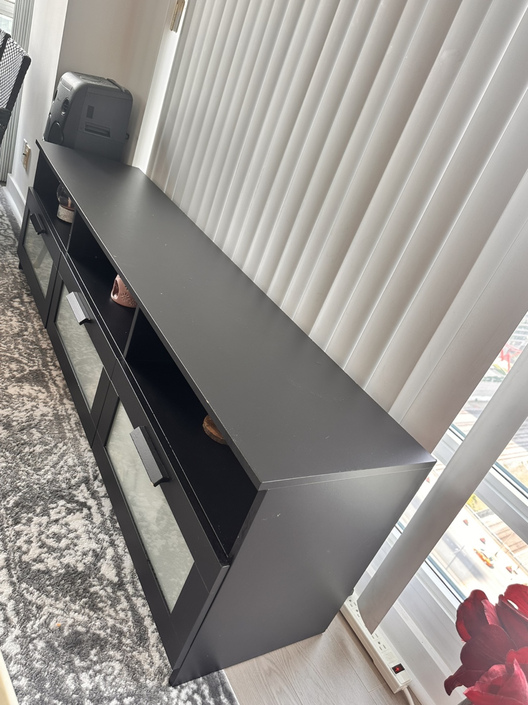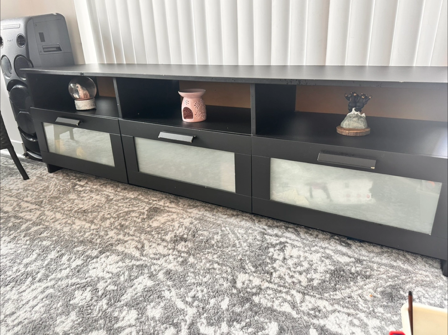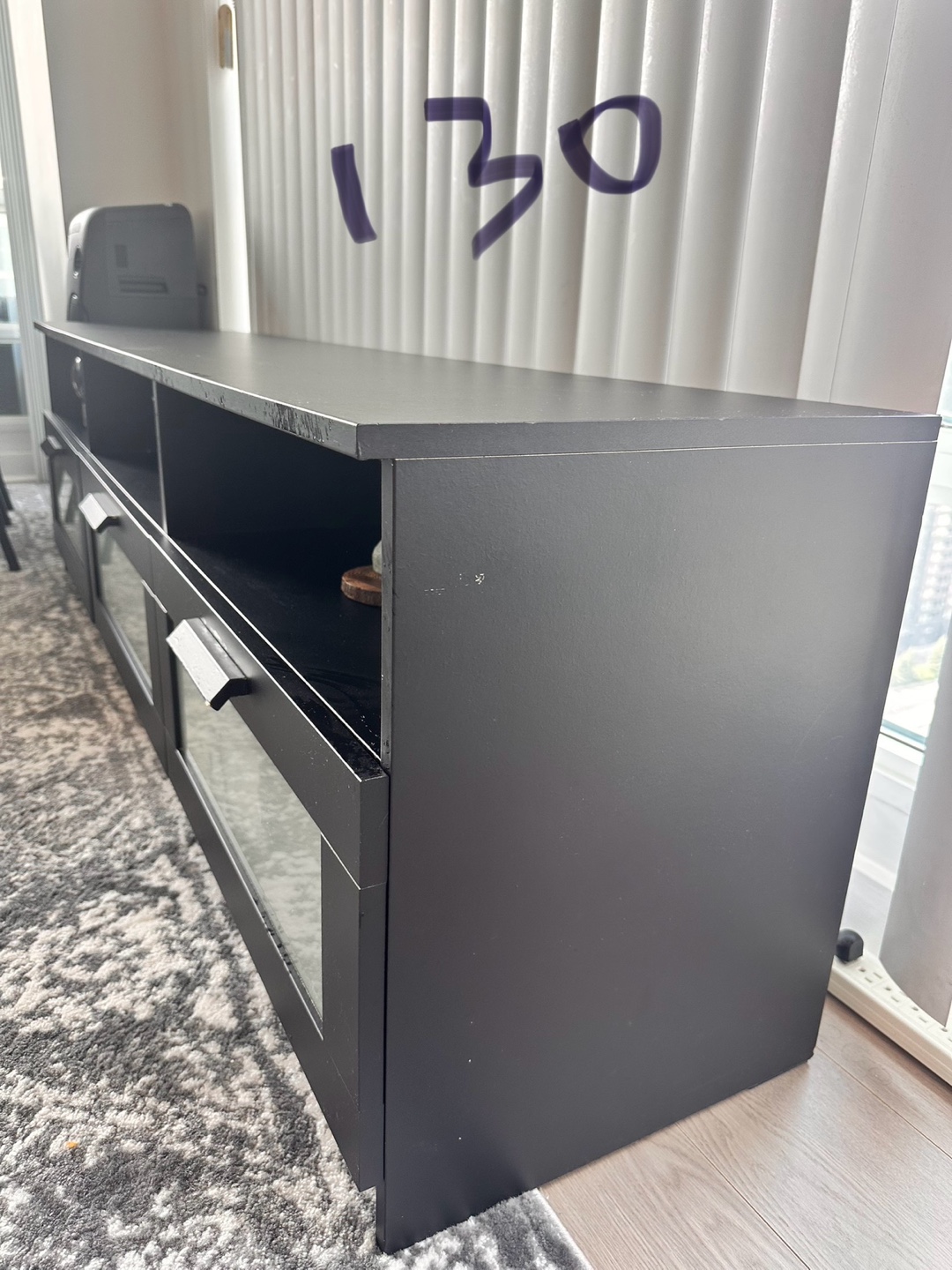 Selling a black TV stand from IKEA! It has a sleek design with glass doors, perfect for storing your media devices and keeping your living room organized. There are some minor signs of use.