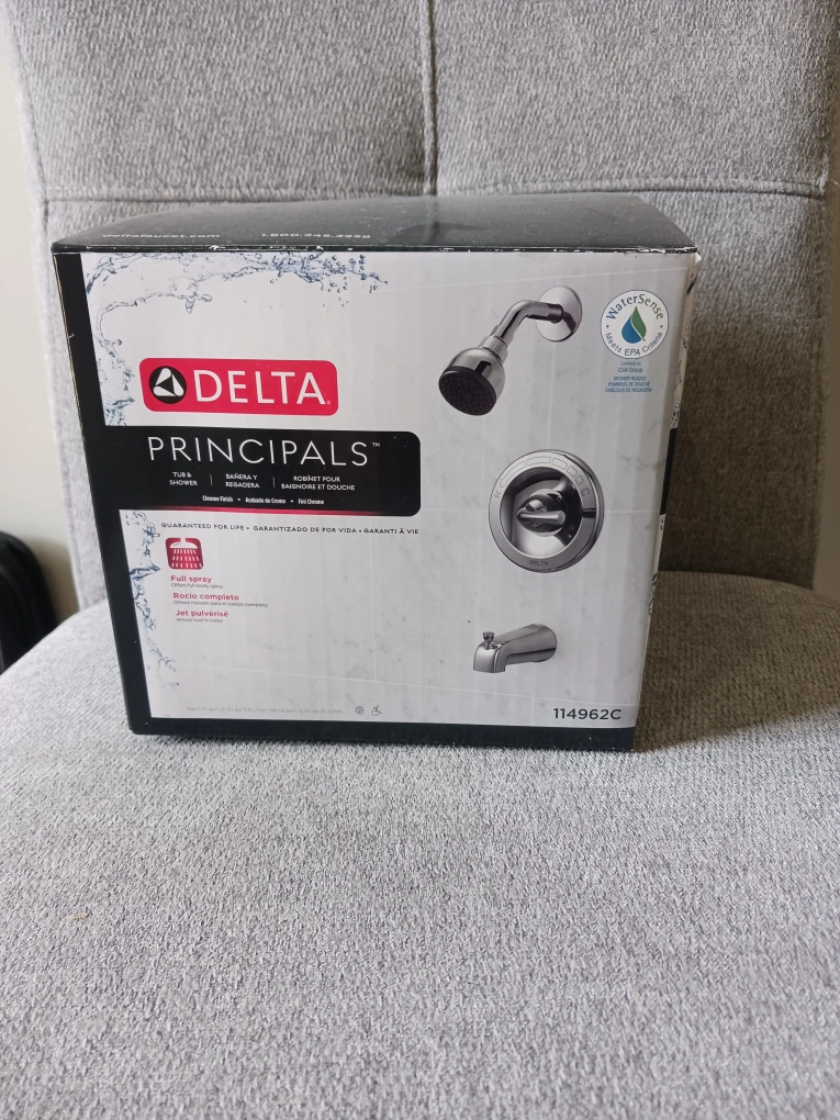Selling a brand new Delta Principals tub and shower faucet. It comes in its original box and is guaranteed for life! Perfect fit and easy to install with step-by-step instructions available on Delta's website. It also has WaterSense technology. Never taken out of the box. No pieces missing.